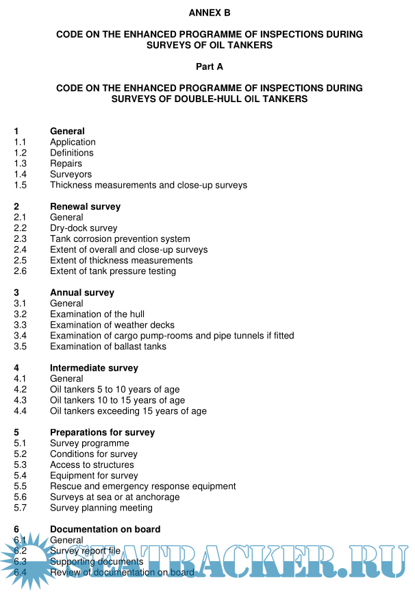The ESP Code has been developed to provide a consistent survey standard for the regular and safe survey of the cargo and ballast areas of oil tankers and bulk carriers. The intention of the Code is to ensure that an appropriate level of review of plans and documents is conducted and consistency in application is attained. Such review of survey reports, survey programmes and planning documents should be carried out at the managerial level of the Administration or organization recognized by the Administration (hereinafter both are referred to as "the Administration").