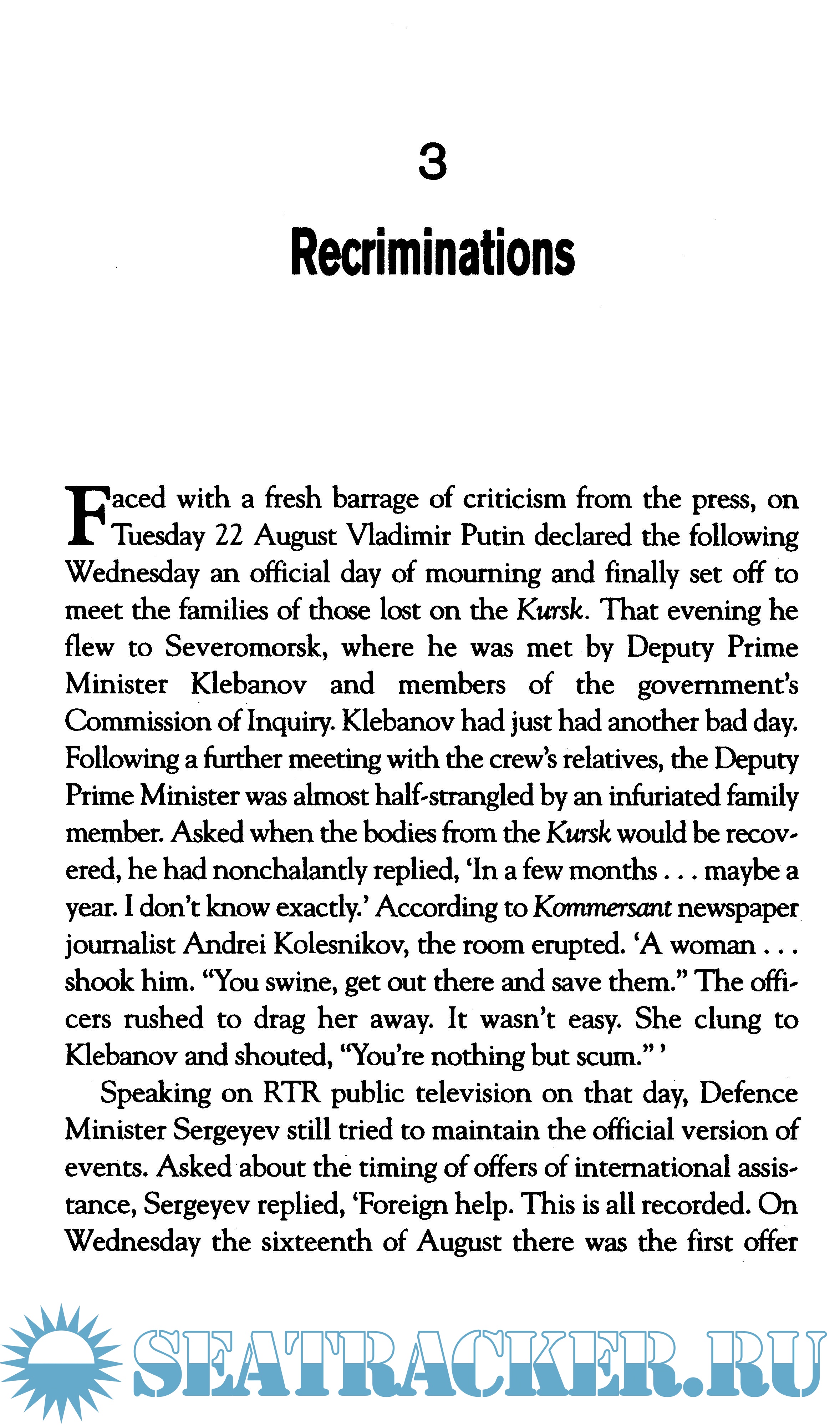 Year: 2003 Language: english Author: Truscott P. Genre: History Publisher: Simon & Schuster Ltd ISBN: 978-0743449410 Format: DjVu Quality: Scanned pages Pages count: 297 Description: In the worst peacetime disaster experienced by the Russian Navy, on 12 August 2000 the state-of-the-art nuclear-powered Kursk submarine sank with the loss of 118 officers and crew. The sinking was a humanitarian, environmental, and military catastrophe for Russia, and a powerful political reversal for President Putin But what really happened? Peter Truscott, former Foreign Affairs and Defence spokesperson in the European Parliament and Vice-President of the Security Committee, aims to provide the answers. An expert on Russia, with a modern history doctorate from Oxford University, Truscott has met President Mikhail Gorbachev, three Russian Prime Ministers, two parliamentary Speakers and the leaders of all Russia's political parties over the past decade. For this book, the author has also interviewed relatives of the crew; Russian, British and American nuclear submarine commanders; international torpedo experts; politicans; diplomats; British and Norwegian rescue teams and their leaders; submariners; seismologists and members of the defence and intelligence communities This work vividly re-creates the terrible final hours of the crew as they waited in vain for rescue .