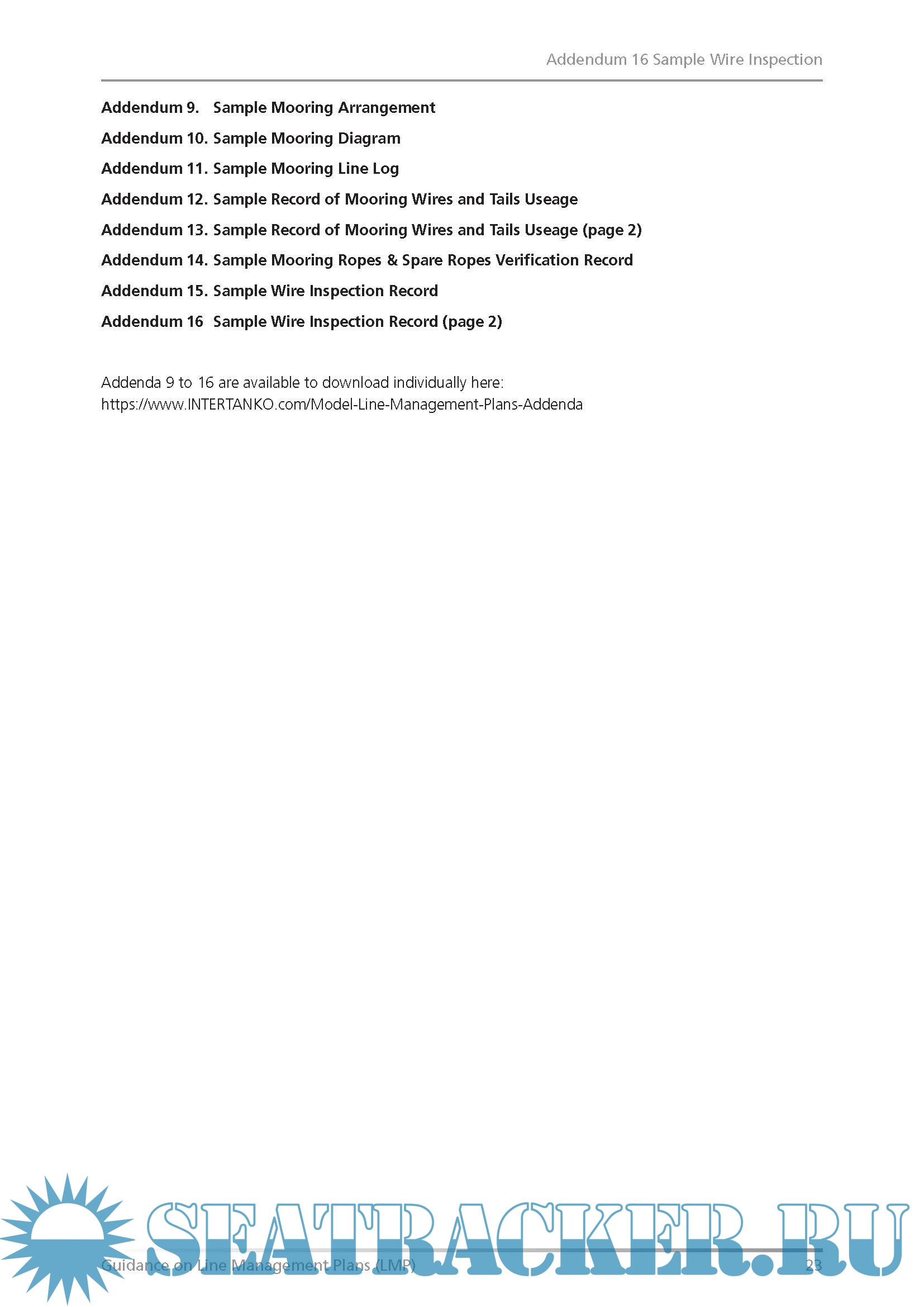 Year: 2019 Language: english Author: Intertanko Genre: Guide Format: PDF Quality: OCR without errors Pages count: 46 Description: INTERTANKO has developed this guidance to help Members comply with MEG4 and to address the questionsin VIQ7. The guidance covers the implementation of the Standard Mooring System Management Plan (MSMP),the Mooring System Management Plan Register (MSMPR) which is a subset of the MSMP and the Line Management Plan (LMP). These plans are new tools to assist Members with managing equipment and lines from design to retirement. MEG4 states that the plans should remain on the ship throughout its life as part of the management of change records to ensure that documents and records are not lost and it is recommended that all information relevant to the mooring of the ship is considered together as a complete system. The plans should also include a record of any changes that have occurred to the mooring equipment and arrangements since the vessel was built. In the maintenance section it should detail the installation, storage, repair, maintenance and wear and tear, while at every stage referencing any manufacturer’s guidance. Similarly, the inspection section should detail how and when the inspection should be undertaken. Typical components include: • Records of mooring hours. • Line inspection records and plans. • Manufacturer and operator retirement criteria. • Test/inspection reports. • Manufacturer’s recommendations following tests or inspections. MEG4 stresses that it is the responsibility of the operator to ensure the proper development and implementation of the LMP. As with the Mooring System Management Plan Register (MSMPR), it is a live document and can be held either in hard or soft version. It should, however, be integrated into the ship’s document control system and be subject to change management controls to ensure a complete history. The LMP should be easily accessible for internal and external compliance verification, ship personnel training and communication with manufacturers by those who need to use it.