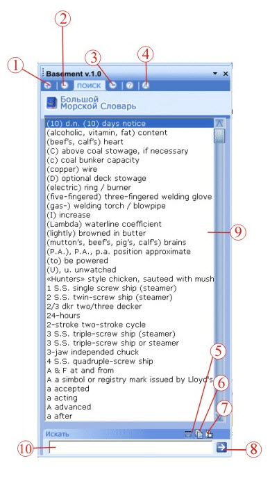 (1)-Кнопка для добавления слова или выражения в словарь, нажав на нее появится оно “Добавление в персональный словарь”. Кнопка (1б) в активном состоянии(как в наглядном примере показанном выше) говорит о том, что слова добавляются в англо-русский словарь, если же активна кнопка (1в) то слова будут добавлены в русско-английский словарь. В . Чтобы добавить слово с переводом в словарь необходимо заполнить поле (1г) введя в него слово а поле (1д) ввести перевод, затем нажать кнопку (1а). (2)-Кнопка удаления слов и выражений из словаря (вы можете удалить только те слова и выражения которые были добавлены вами) (3)-Кнопка закрепления окна иллюстрированного словаря поверх всех остальных (4)-Информация о разработчиках программы (5)-Виртуальная кириллическая клавиатура ( необходима если на компьютере не установлен русский язык или русские буквы не нанесены на кнопки клавиатуры) (6)-Копировать содержимое из окна Искать(10) (7)-Вставить содержимое буфера обмена (ранее вырезанную или скопированную текстовую информацию) в окно Искать(10) (8)-Позволяет осуществить переход на слово(фразу), которые содержат фрагмент текста, набранный в (10). (9)-Окно списка слов и выражений, при двойном клике на слове или выражение из списка, проявляется окно с его переводом.