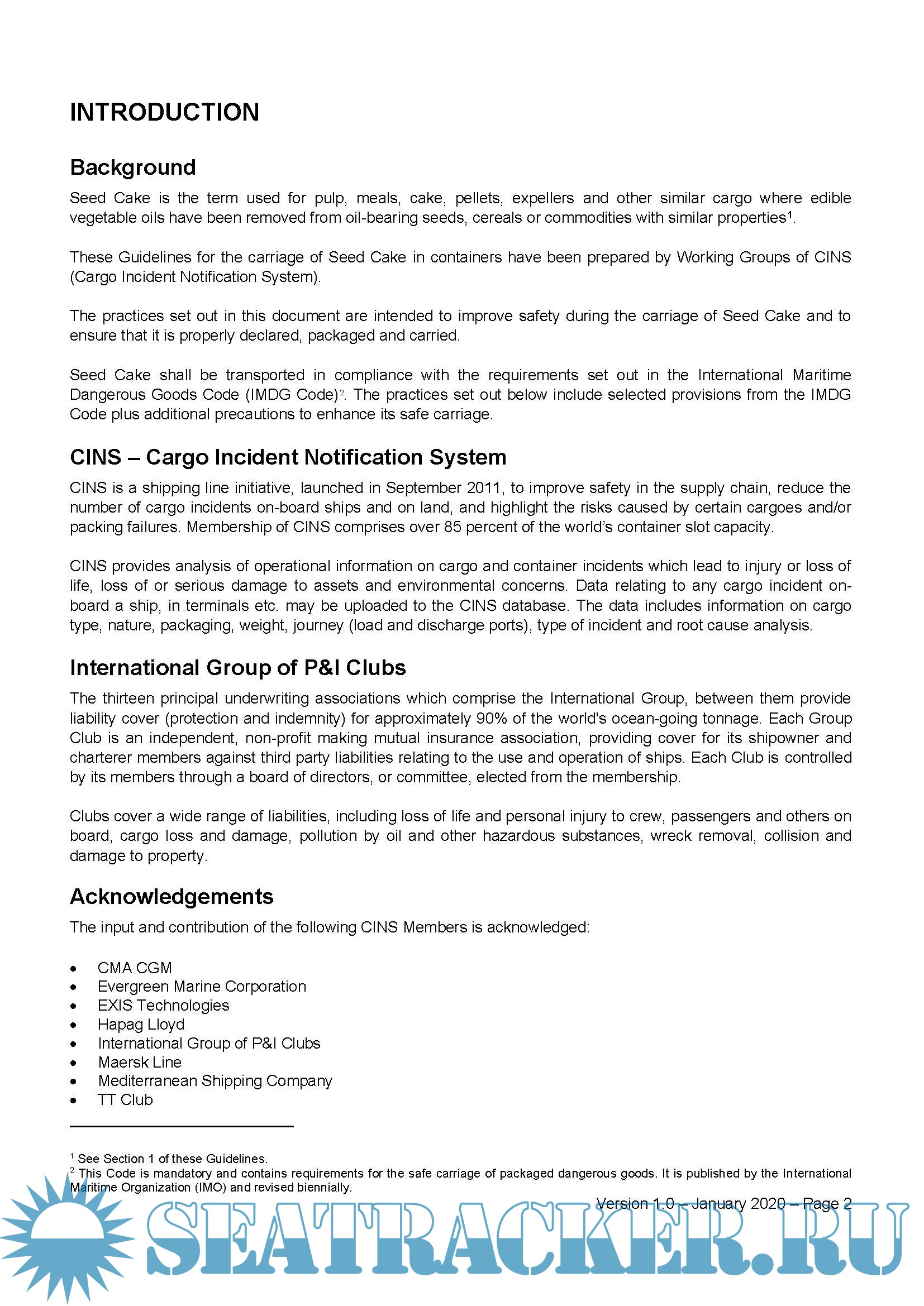 Year: 2020 Language: english Author: CINS Genre: Guide Format: PDF Quality: eBook Pages count: 8 Description: Seed Cake is the term used for pulp, meals, cake, pellets, expellers and other similar cargo where edible vegetable oils have been removed from oil-bearing seeds, cereals or commodities with similar properties1. These Guidelines for the carriage of Seed Cake in containers have been prepared by Working Groups of CINS (Cargo Incident Notification System). The practices set out in this document are intended to improve safety during the carriage of Seed Cake and to ensure that it is properly declared, packaged and carried. Seed Cake shall be transported in compliance with the requirements set out in the International Maritime Dangerous Goods Code (IMDG Code)2. The practices set out below include selected provisions from the IMDG Code plus additional precautions to enhance its safe carriage.