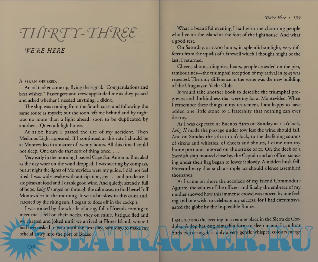 Year: 1960 Language: english Author: Vito Dumas Genre: Handbook Publisher: International Marine Edition: First ISBN: 0-07-137611-9 Format: PDF Quality: Scanned pages Pages count: 216 Description: "One of the classic small-boat voyages of all time."--Jonathan Raban In June 1942, Vito Dumas set off from Buenos Aires for a trip around the world unlike any previous circumnavigation--eastward over the "impossible route," the Roaring Forties of the Southern Ocean: south of the Cape of Good Hope, south of Australia, and south of Cape Horn. His craft, the Lehg II, a 31-foot ketch named for his mistress, carried only the most makeshift gear and provisions. He refused to carry a sea anchor, a bilge pump, or more than one screwdriver, and he had so few clothes that he had to stuff them with newspaper to keep warm. He also sailed without a radio, since carrying one during wartime might have labeled him a spy. He was the first to complete the 20,000-mile voyage singlehanded, the first solo sailor to round Cape Horn and survive, and the first to sail around the world with only three landfalls (in South Africa, New Zealand, and Chile). But what sets this story apart is Dumas's powerful prose, recording elation and depression, hardship and relaxation, and, above all, his unrelenting determination in the face of adversity. The terror of sailing through massive storms without respite from the helm alternates with periods of relative calm when he reflects on the enchanting nature of the sea. His trio of landfalls--sojourns he called "calm waters where my spirit could rest"--add yet another distinction to this beautiful tale. Alone Through the Roaring Forties is also a tribute to Lehg II, Dumas's beloved boat. He calls her his "shipmate," and "faithful companion," "an ideal floating house of extraordinary strength and endurance," and had complete faith in her abilities and performance. Additional info: Please see my other releases! https://seatracker.ru/search.ph...1&uid=170047 Посмотрите мои другие раздачи: https://seatracker.ru/tracker.p...id=54420#results