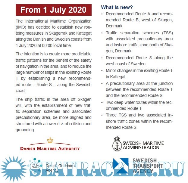 Description: The International Maritime Organization (IMO) has decided to establish new routeing measures in Skagerrak and Kattegat along the Danish and Swedish coasts from 1 July 2020 at 00:00 local time. The intention is to create more predictable traffic patterns for the benefit of the safety of navigation in the area, and to reduce the large number of ships in the existing Route T by establishing a new recommended route – Route S – along the Swedish coast.