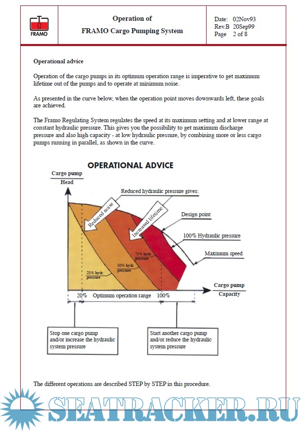 Year: 1993 Language: english Author: Frank Mohn Services AS Genre: Technical book Publisher: Frank Mohn Services AS Edition: 1993 Format: PDF Quality: Scanned pages + text layer Pages count: 8 Description: Operation of the cargo pumps in its optimum operation range is imperative to get maximum lifetime out of the pumps and to operate at minimum noise. As presented in the curve below, when the operation point moves downwards left, these goals are achieved. The Framo Regulating System regulates the speed at its maximum setting and at lower range at constant hydraulic pressure. This gives you the possibility to get maximum discharge pressure and also high capacity - at low hydraulic pressure, by combining more or less cargo pumps running in parallel, as shown in the curve.