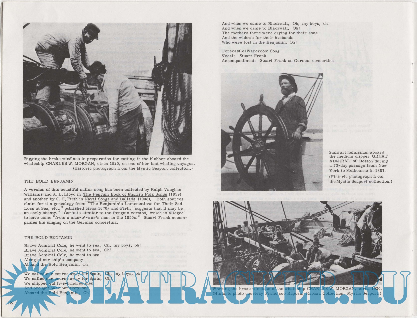 Year: 1978 Language: english Author: Frank S.M. at all. Genre: History Publisher: Folkways Records Format: PDF Quality: Photo of pages Pages count: 22 Description: This album features classic sea shanties from the 19th century, "sung in the traditional manner, accompanied on historic 19th-century instruments, and recorded aboard historic sailing ships" at the Mystic Seaport Maritime Museum. Shanties were sung to make the heavy labor aboard merchant sailing vessels more coordinated, efficient, and lighter. "To hear a good yarn, and sing out a lively, rowdy chorus, was far more pleasurable" than listening to the Bosun yelling orders. Liner notes include background on chanties, song lyrics, and black-and-white photographs of sailors. Additional info: Recorded aboard the historic ships Charles W. Morgan and Joseph Conrad.