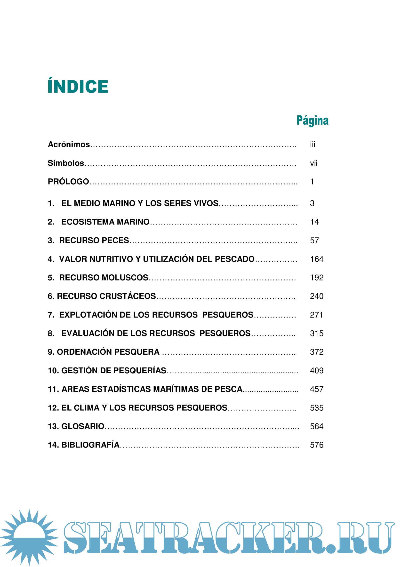 Acrónimos………………………………………………………………….. iii Símbolos……………………………………………………………………. vii PRÓLOGO…………………………………………………………………... 1 1. EL MEDIO MARINO Y LOS SERES VIVOS………………………... 3 2. ECOSISTEMA MARINO………………………………………………. 14 3. RECURSO PECES……………………………………………………... 57 4. VALOR NUTRITIVO Y UTILIZACIÓN DEL PESCADO……………. 164 5. RECURSO MOLUSCOS………………………………………………. 192 6. RECURSO CRUSTÁCEOS……………………………………………. 240 7. EXPLOTACIÓN DE LOS RECURSOS PESQUEROS……………. 271 8. EVALUACIÓN DE LOS RECURSOS PESQUEROS…………….. 315 9. ORDENACIÓN PESQUERA ………………………………………….. 372 10. GESTIÓN DE PESQUERÍAS………................................................ 409 11. AREAS ESTADÍSTICAS MARÍTIMAS DE PESCA......................... 457 12. EL CLIMA Y LOS RECURSOS PESQUEROS…………………….. 535 13. GLOSARIO…………………………………………………………….... 564 14. BIBLIOGRAFÍA…………………………………………………………. 576