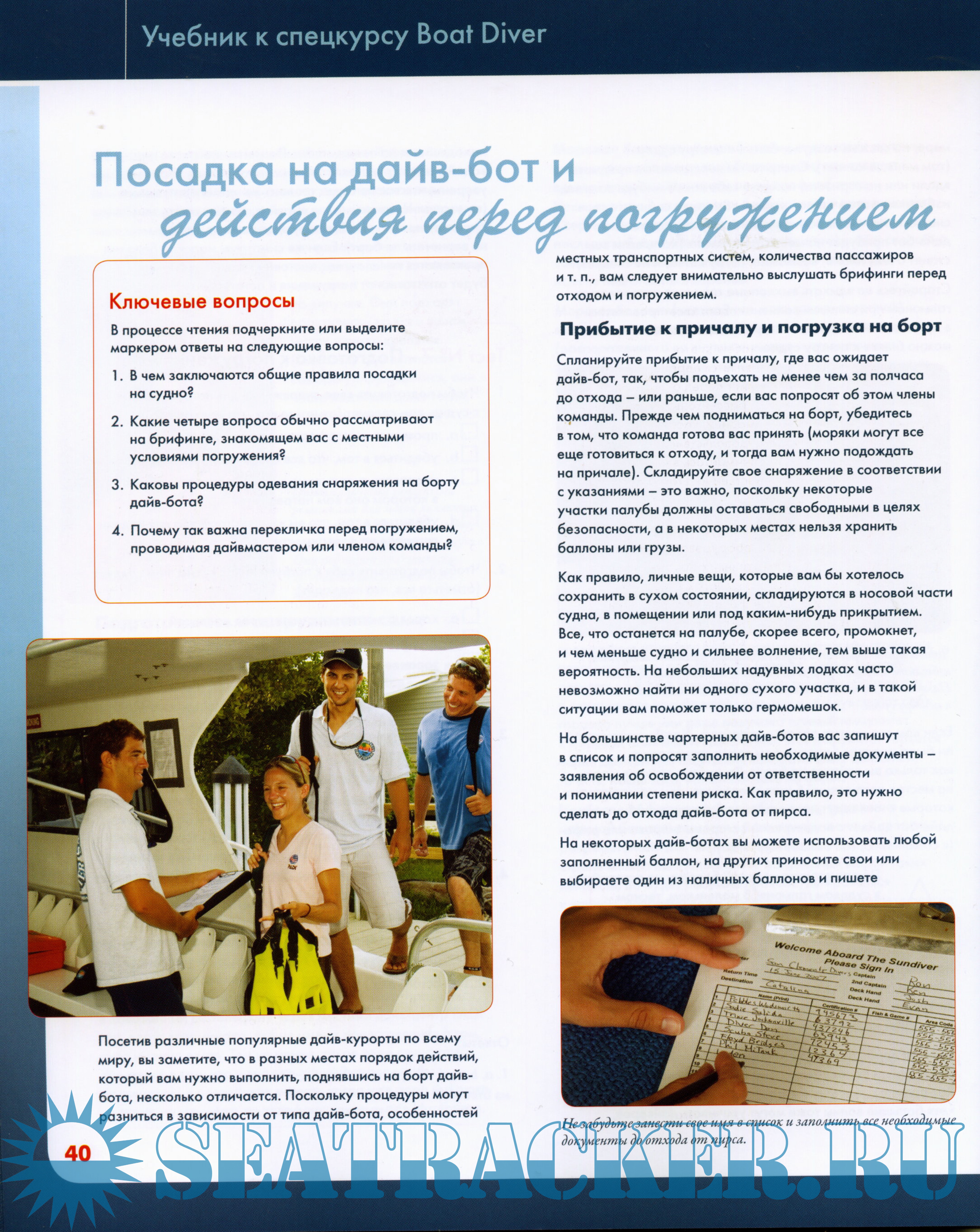 Год выпуска: 2008 Язык: русский Автор: International PADI, Inc. Жанр: Учебное пособие Издательство: International PADI, Inc. ISBN: 978-5-903909-05-6 Формат: PDF Качество: Отсканированные страницы Количество страниц: 66 Описание: Спецкурс PADI Boat Diver предоставит вам необходимые знания для того, чтобы с удовольствием совершать безопасные погружения с борта дайв-бота, о также даст общее представление о морской nпрактике. Структура спецкурса достаточно гибкая, он принесет вам пользу независимо от того, планируете ли вы нырять с борта крупного чартерного дайв-бота в тропических водах или с маленькой частной лодки в умеренном климатическом nпоясе. Спецкурс научит вас извлекать из погружений с дайв-ботов намного больше удовольствия, независимо от того, используете ли вы плавсредства, чтобы добраться до места погружения или рассматриваете прогулки по воде как отдельный вид развлечений. Заявление об ограничении ответственности. Дайвинг - это вид занятий, сопряженный с риском. Каждый дайвер в отдельности, принимающий участие в любом виде погружений, обязан согласиться с рисками и принять на себя ответственность за свои действия. Автор и издатель (и уж тем более раздающий) не несут никакой ответственности ни перед кем за утери, повреждения, травмы или смерть, вызванные любыми ошибками, пропусками в тексте, а также личной интерпретацией текста дайвером. Любая подобная ответственность не признается. Информация в данном пособии относится к дайвинrу с аквалангом и должна использоваться только как дополнение к утвержденному курсу обучения, который проводит сертифицированный инструктор. Данный учебник не может заменить профессиональный инструктаж и здравое отношение.