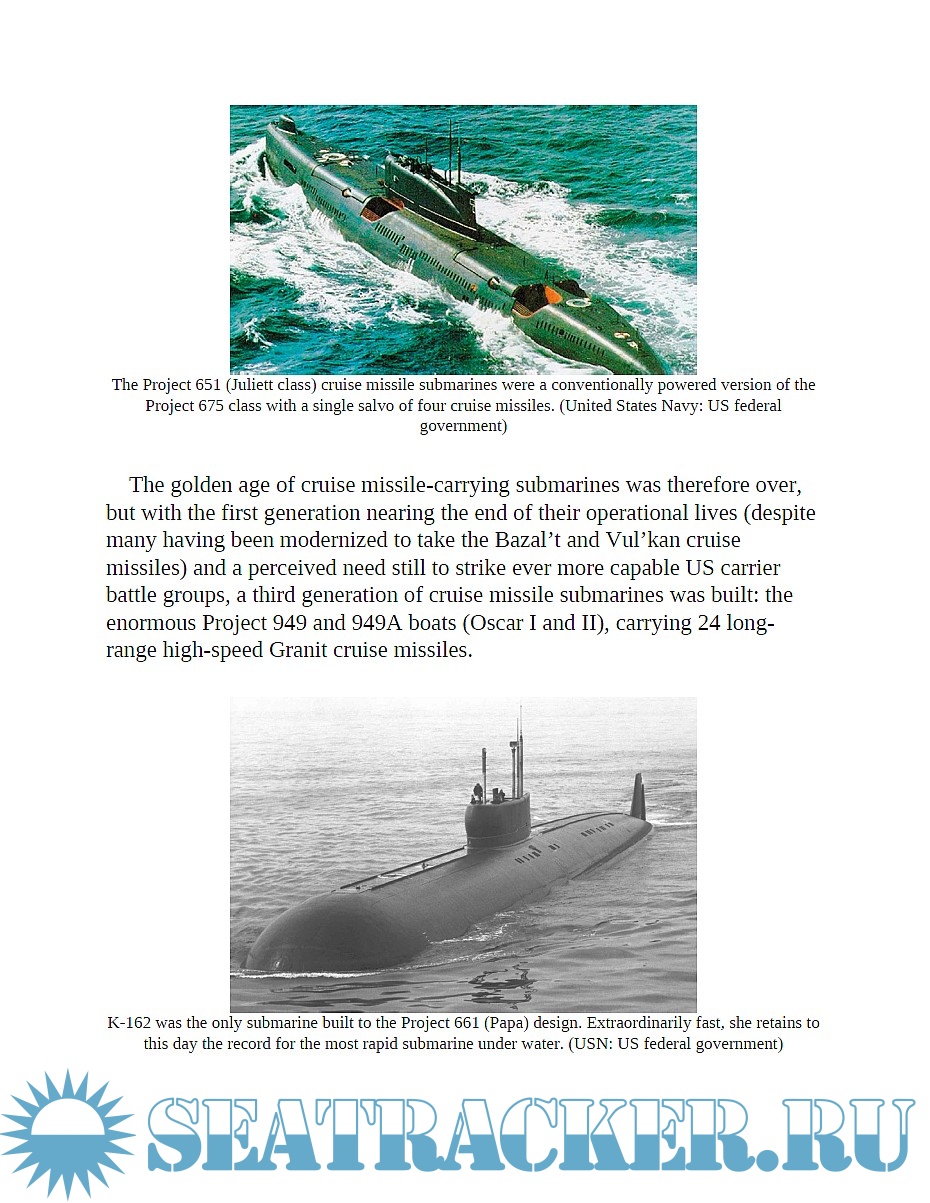 Year: 2018 Language: english Author: Edward Hampshire Genre: History Publisher: Osprey Publishing ISBN: 9781472825018 Format: PDF Quality: eBook Pages count: 95 Description: This book fully illustrates one of the most formidable weapons of the Cold War, the cruise missile submarines. They were initially designed to strike targets on the eastern coast of the United States by nuclear-tipped cruise missiles designed. However, By the late 1960s, submarine-launched ballistic missiles made the nuclear land-attack mission unnecessary, so existing submarines were converted and armed with antiship cruise missiles designed to destroy US super-carriers and other important naval targets. Topics cover the Soviet naval strategy on submarines, from the modified Whiskey to the Oscar II and Yankee classes, and the develop of weapons systems and sensors.