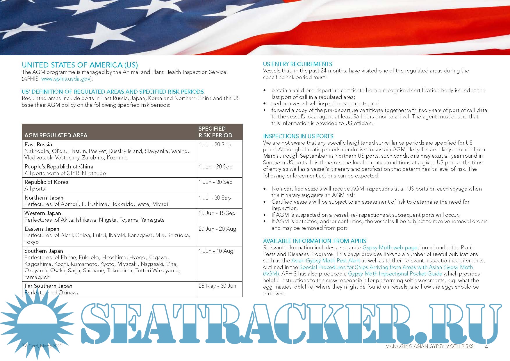 Year: 2021 Language: english Author: Gard Genre: Handbook Format: PDF Quality: eBook Pages count: 11 Description: Vessels calling at certain ports in the Asia Pacific between May and September should be inspected and “certified free of Asian Gypsy Moth” prior to departure, this to minimise the potential for regulatory action when arriving in a country where this destructive forest pest is not native. The Asian Gypsy Moth (AGM, including Lymantria dispar asiatica, Lymantria dispar japonica, Lymantria albescens, Lymantria umbrosa, Lymantria postalba) is a destructive forest pest known to spread via ocean-going vessels in international trade. The pest has established populations only in countries in the Asia Pacific, such as Russia, China, Korea, and Japan. If introduced in countries where it does not exist naturally, it has the potential to seriously affect the country’s agricultural and forest resources. Adult moths frequently lay their egg masses on vessels and shipping containers, and since these egg clusters often survive to hatch at ports of call around the world, exclusion efforts are considered a priority by many local port authorities. Preventing the introduction and spread of AGM is a shared responsibility that relies on cumulative efforts at origin, en route and at arrival in port. However, it is the responsibility of the ship operator to meet all port entry requirements related to AGM and managing the risk at its origin to ensure that a vessel is free of AGM upon departure from ports in the infested areas is recognised as the key measure. Frequently asked questions (FAQ) General knowledge about the AGM and each country’s requirements on how to manage AGM risks will minimise the potential for regulatory action and delays during port entries. The purpose of this FAQ is therefore to provide answers to some of the AGM related questions raised by Gard’s Members and clients, to summarises the requirements set forth by each of the regulating countries and provide links to relevant government websites. The FAQ also contains guidelines for how the crew can carry out systematic self-inspections onboard the vessel while en route. .