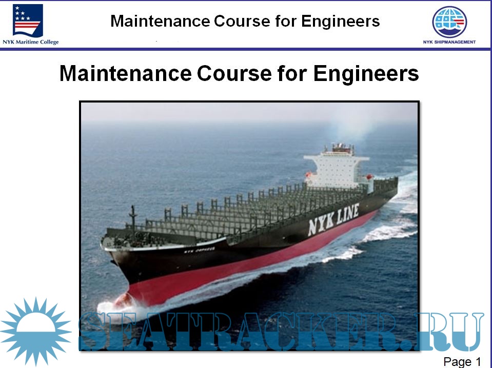 Year: 2xxx Language: english Author: NYK Maritime College Publisher: NYK Maritime College, Singapore Format: PPT Quality: eBook Pages count: 270 Description: Objective: After completion of training the trainees will have adequate knowledge (Common Sense) regarding the following topics: * Management of work site and safety of work. * Planning of Engine maintenance and Supervision * General Maintenance Knowledge. º Inspection of machinery during overhauling º Fault finding and remedy º Overhauling and servicing procedure.