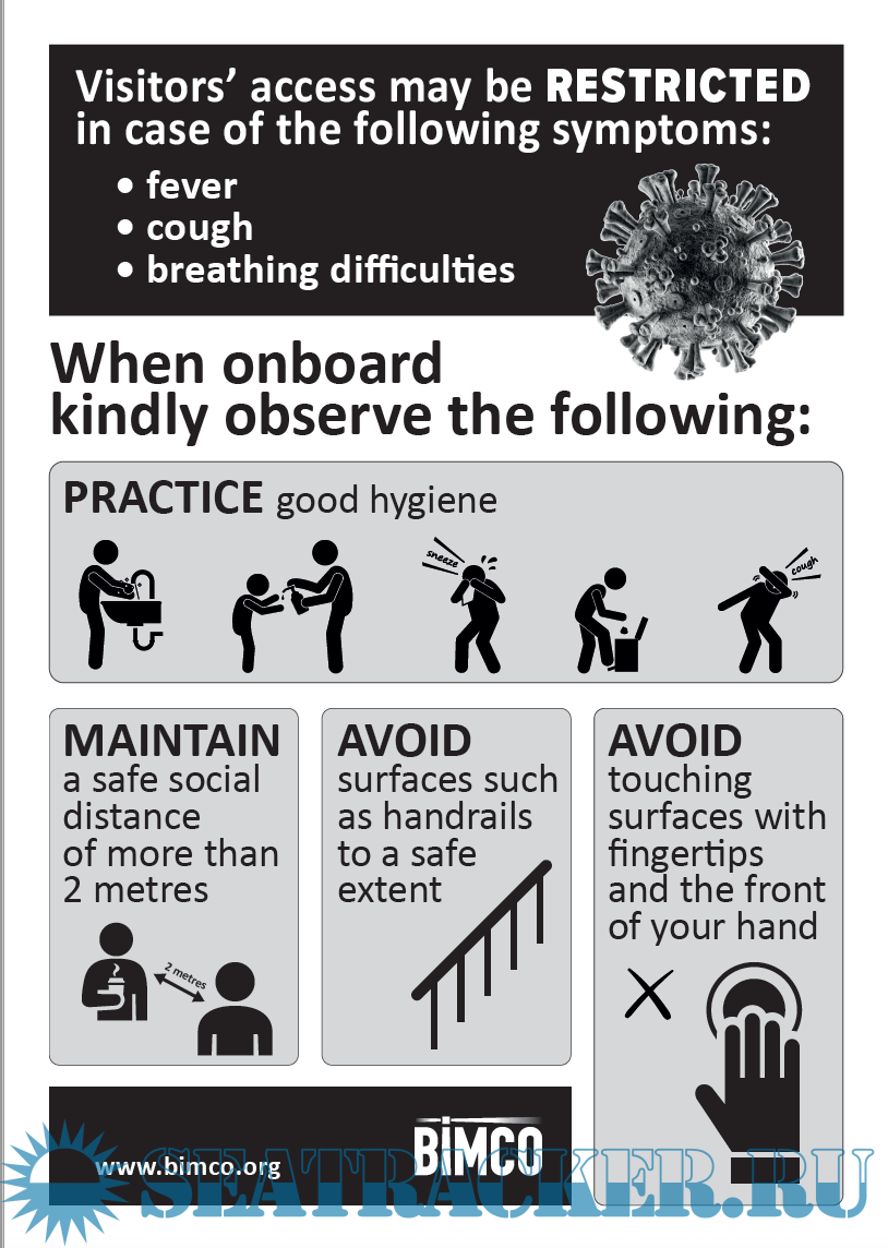 Year: 202x Language: english Author: BIMCO Genre: Other Format: PDF Quality: eBook Pages count: Multiple Description: BIMCO-made posters to protect seafarers and visitors onboard ships against Coronavirus (COVID-19). Black-and-white and coloured posters that can be easily printed and used onboard ships at shoreside, shipside of gangways as well at various locations in the accommodation.