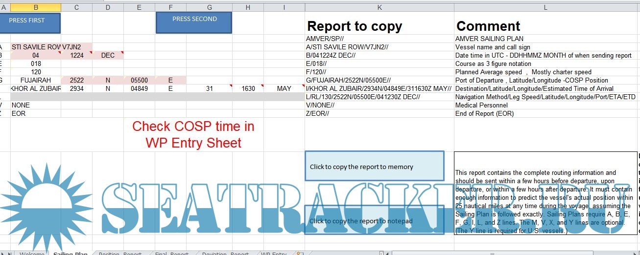 Description: This is a program I made to make AMVER reporting easier. Just export the route from ECDIS into csv fromat , paste it in excel , add a few necessary details and press the button. Thats all you have to do. I have changed few things on it. I hope now the procedure becomes much easier.If you have any feedback , please do tell me
