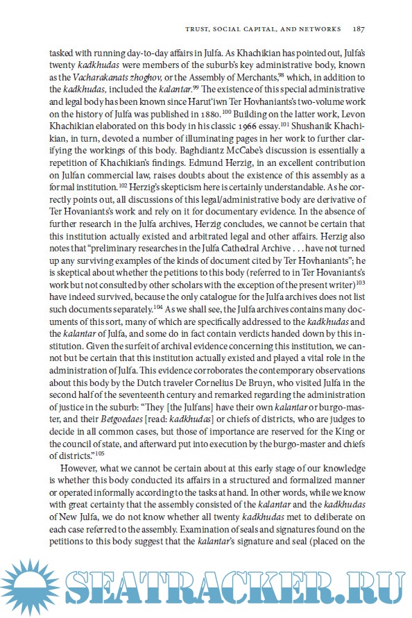 Year: 2011 Language: english Author: Sebouh David Aslanian Genre: History Publisher: University of California Press ISBN: 978-0-520-26687-2 Format: PDF Quality: eBook Pages count: 389 Description: Drawing on a rich trove of documents, including correspondence not seen for 300 years, this study explores the emergence and growth of a remarkable global trade network operated by Armenian silk merchants from a small outpost in the Persian Empire. Based in New Julfa, Isfahan, in what is now Iran, these merchants operated a network of commercial settlements that stretched from London and Amsterdam to Manila and Acapulco. The New Julfan Armenians were the only Eurasian community that was able to operate simultaneously and successfully in all the major empires of the early modern world--both land-based Asian empires and the emerging sea-borne empires--astonishingly without the benefits of an imperial network and state that accompanied and facilitated European mercantile expansion during the same period. This book brings to light for the first time the trans-imperial cosmopolitan world of the New Julfans. Among other topics, it explores the effects of long distance trade on the organization of community life, the ethos of trust and cooperation that existed among merchants, and the importance of information networks and communication in the operation of early modern mercantile communities.