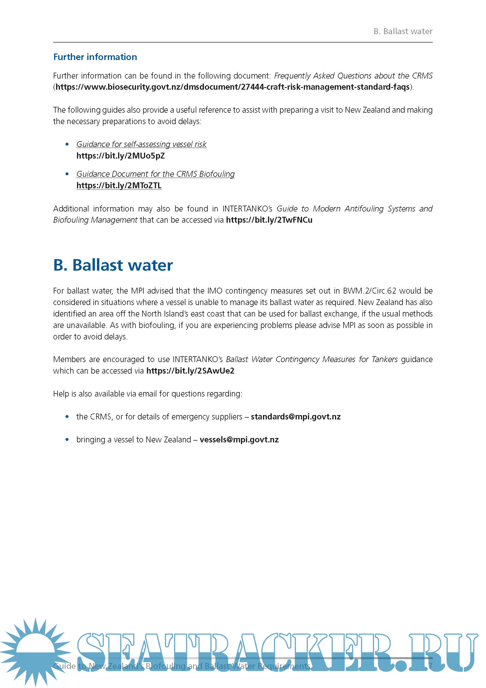 Year: 2019 Language: english Author: INTERTANKO Genre: Guide Format: PDF Quality: eBook Pages count: 9 Description: Members’ experiences with New Zealand’s biofouling regulations (Craft Risk Management Standard – CRMS) were up for discussion at the September 2018 meeting of INTERTANKO’s Environmental Committee. It was noted that the New Zealand Ministry of Primary Industries (MPI) has issued Notices of Direction to vessels informing them to stay outside New Zealand territorial waters until their hulls are cleaned; this being despite the fact that there are no cleaning facilities in New Zealand. As a result of this, the Environmental Committee supported the need to open a dialogue with the New Zealand authorities on the issue and, following the INTERTANKO Secretariat’s engagement with New Zealand’s MPI, the latter provided relevant information that Members should take note of and which has been included in this Guide.
