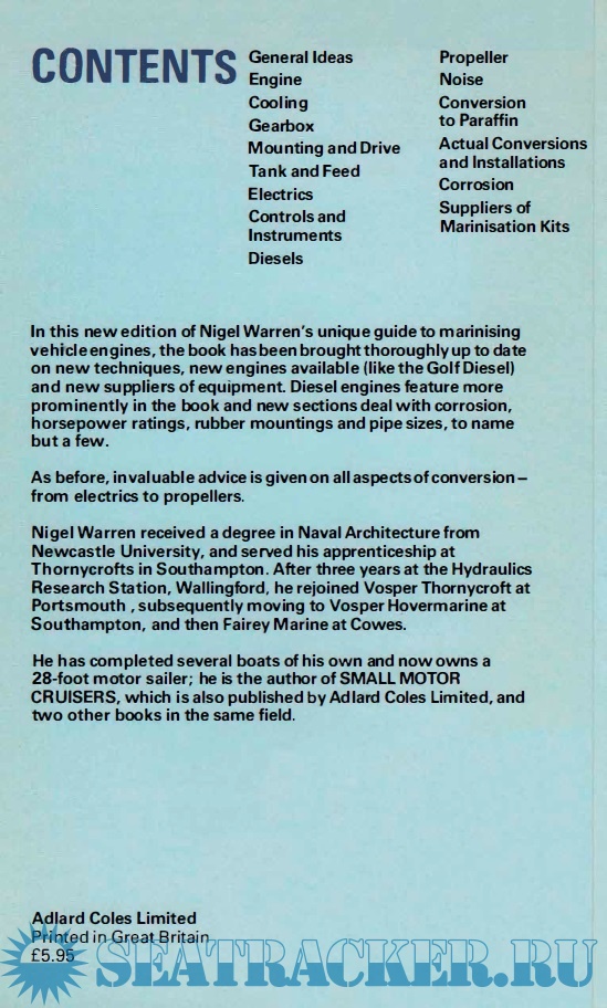 Year: 1985 Language: english Author: Nigel Warren Genre: Technical book Publisher: Adlard Coles Edition: 2 ISBN: 0-229-11770-8 Format: PDF Quality: OCR with errors Pages count: 199 Description: In this new edition of Nigel Warren's unique guide to marinising vehicle engines, the book has been brought thoroughly up to date on new techniques, new engines available (like the Golf Diesel) and new suppliers of equipment. Diesel engines feature more prominently in the book and new sections deal with corrosion, horsepower ratings, rubber mountings and pipe sizes, to name but a few. As before, invaluable advice is given on all aspects of conversion - from electrics to propellers. Nigel Warren received a degree in Naval Architecture from Newcastle University, and served his apprenticeship at Thornycrofts in Southampton. After three years at the Hydraulics Research Station, Wallingford, he rejoined Vosper Thornycroft at Portsmouth , subsequently moving to Vosper Hovermarine at Southampton, and then Fairey Marine at Cowes. He has completed several boats of his own and now owns a 28-foot motor sailer; he is the author of SMALL MOTOR CRUISERS, which is also published by Ad lard Coles Limited, and two other books in the same field.
