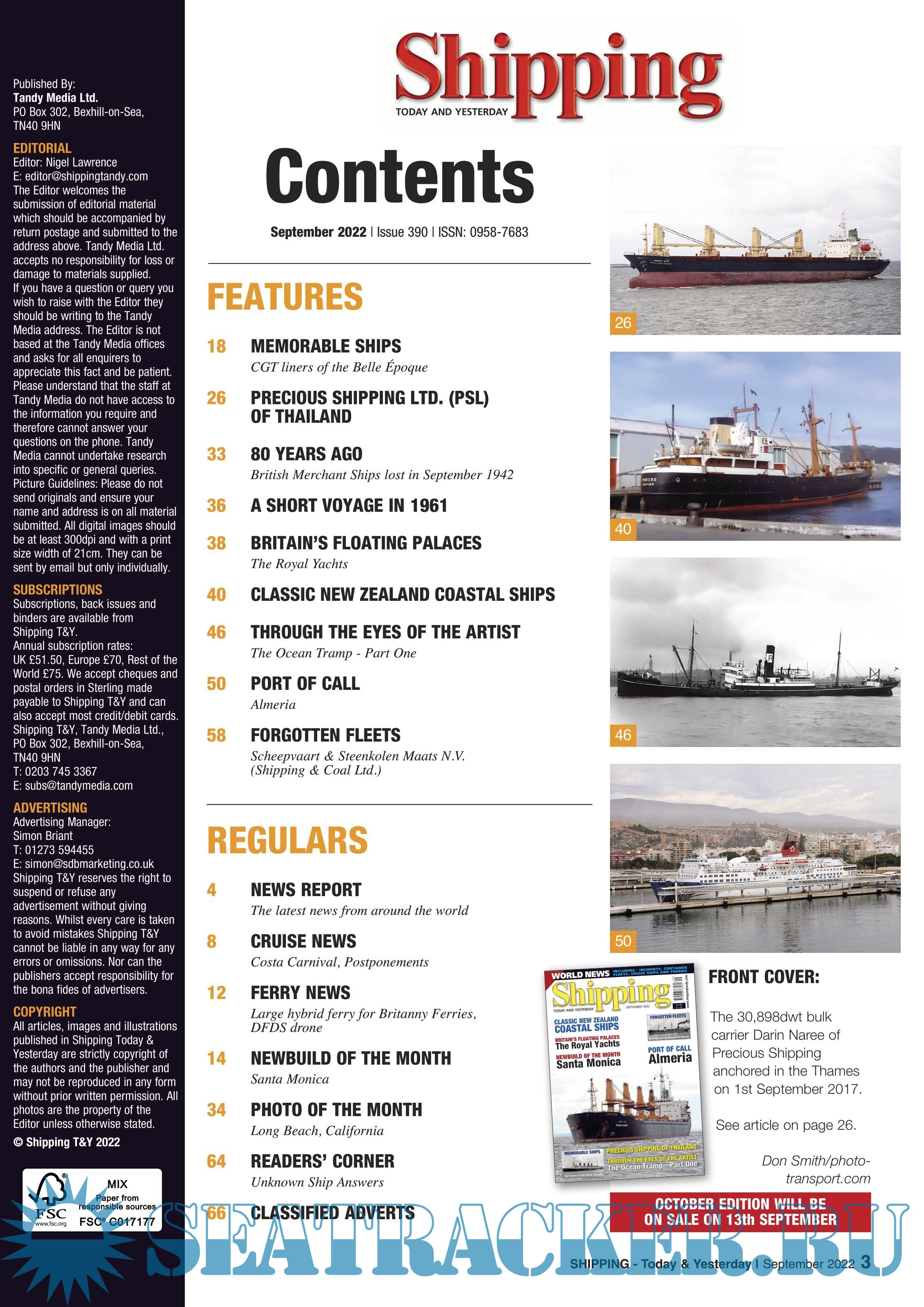 Year: 2022 Language: english Author: Nigel Lawrence (Editor) Genre: Periodical (magazine) Publisher: TANDY Media Format: PDF Quality: eBook Pages count: 68 Description: Shipping Today & Yesterday is a specialist magazine for the shipping enthusiast offering up-to-date information, topical and in-depth historical articles. Shipping Today & Yesterday was first produced in March 1990 by, the then Editor and Publisher, John Young. The first edition stated that it would, “offer a news service covering important developments in the Shipping industry Today and will look back at ships and events of Yesterday, with regular features on merchant ships. See "Contents" for details. Issue No.390 September 2022
