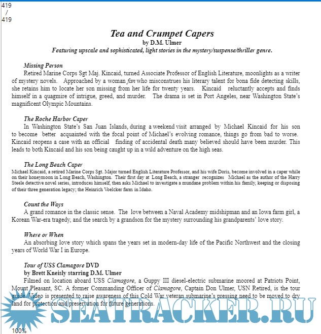 Veteran author D.M. Ulmer is a 1954 graduate of the U.S. Naval Academy and served a thirty-two year career in the submarine force. He has authored four other novels Silent Battleground, Count the Ways, Missing Person and The Roche Harbor Caper. Ulmer volunteers at the Seattle Museum of Flight and Overlake Hospital Medical Center. He lives in Redmond, WA with his wife Carol.