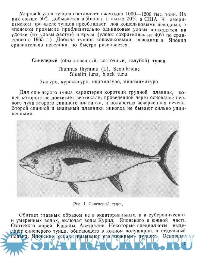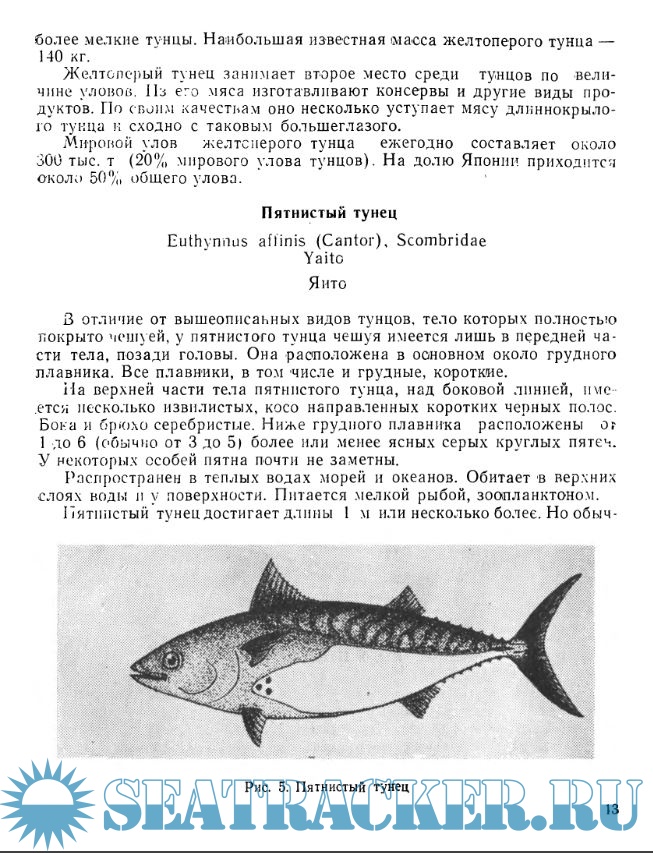 Год выпуска: 1975 Язык: русский Автор: Осипов В.Г. Жанр: Руководство Издательство: ТИНРО Издание: Второе, исправленное и дополненное. Формат: DjVu Качество: Отсканированные страницы Количество страниц: 65 Описание: В брошюре приведены рисунки и краткие описания рыб - объектов лова ярусами. Многие из этих рыб добываются также с помощью кошельковых неводов и удочек. Для лучшей ориентировки в видовом составе рыб сюда кроме главных промысловых объектов включены и другие рыбы не имеющие пока самостоятельного промыслового значения. Рисунки и описания рыб объединены по группам. В первую группу вошли тунцы, во вторую - мечеподобные, в третью - акулы и скаты, в четвертую - прочие рыбы. Внутри отдельных групп материал расположен в порядке, принятом в систематике рыб. Найти рисунок любой рыбы можно по указателю номеров рисунков. Наряду с русскими названиями приводятся научные, английские и японские названия рыб. Для облегчения определения рыб в брошюре определены два схематических рисунка с наименованиями и обозначением особенностей расположения отдельных частей тела и органов описываемых рыб. Автор настоящей брошюры - научный сотрудник Тихоокеанского научно- исследовательского института рыбного хозяйства и океанографии (ТИНРО) В.Г. Осипов.