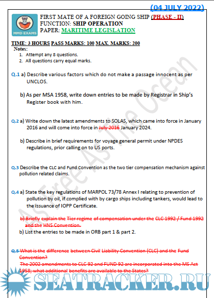 Description: Paper: Maritime Legislation Question paper set for Mercantile Marine Department (MMD), India Exams for Phase II - Chief Mate (F.G.).