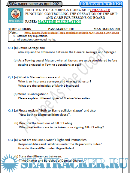 Question Paper Set for Maritime Legislation (November 2022) Phase II (Chief Mate F.G.) Mercantile Marine Department (MMD), India Examinations