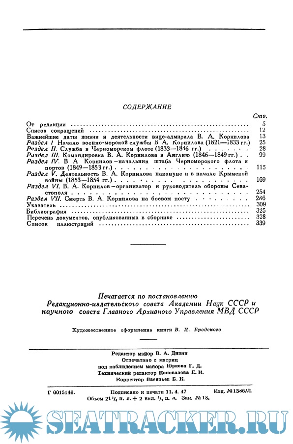Год выпуска: 1947 Язык: русский Автор: Коллектив авторов Жанр: История Издание: Русские флотоводцы Формат: DjVu Качество: Отсканированные страницы Количество страниц: 341 Описание: Предлагаемый вниманию читателей сборник документов, составляя отдельный том серии «Русские флотоводцы», является одновременно логическим продолжением недавно изданного сборника «Адмирал Нахимов». Взаимно дополняя друг друга, эти два издания вводят в научный оборот значительное количество весьма важных источников, до сих пор мало известных или вовсе не известных исторической науке. Предлагается публикация документального наследства В.А. Корнилова, а также документов и материалов, не принадлежащих ему лично, но отражающих его разностороннюю деятельность. Весь документальный материал, включенный в сборник, систематизирован по следующим разделам: 1. Начало военно-морской службы В.А. Корнилова (1821 — 1833 гг.). 2. Служба в Черноморском флоте (1833—1846 гг.). 3. Командировка В. А. Корнилова в Англию (1846—1848 гг.). 4. В.А. Корнилов — начальник штаба Черноморского флота и портов (1849—1853 гг.). 5. Деятельность В. А. Корнилова накануне и в начале Крымской войны (февраль 1853 г. — сентябрь 1854 г.). 6. В.А. Корнилов — организатор и руководитель обороны Севастополя. 7. Смерть В.А. Корнилова на боевом посту.