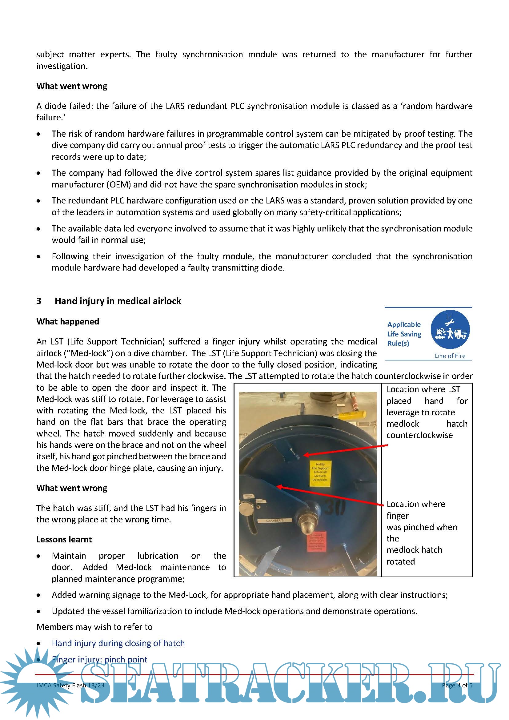 IMCA SF 13/23 Hand injury while using manual torque tool Loss of redundancy in diving bell launch and recovery (LARS) PLC system Hand injury in medical airlock Painter line snapped and hit crew member in the face MSF: Disposable vape self-ignition IMCA SF 12/23 Differential pressure: dummy choke ejected close to divers Crane boom stopper fell to main deck Fire alarm activation in engine room BSEE: Swing rope transfers Close approach of AHTS vessel to offshore rig