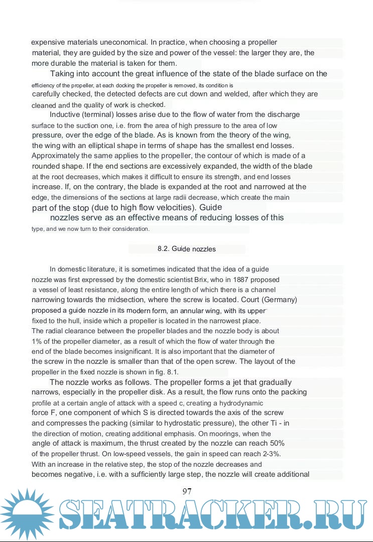 Year: 2007 Language: english Author: S. V. Antonenko Genre: Textbook Publisher: Far Eastern State Technical University ISBN: 978-5-7596-0745-8 Format: PDF Quality: Scanned pages Pages count: 126 Description: Basic information about ship propulsion is provided. A brief historic review of the development of propulsors and the science about them is provided. Ship propellers, methods of their modelling and practical calculationsare considered. Information is provided on the interacton between the propeller,hull, rudder, main power plant, cavitation of propellers and ways to improve their efficiency. Controllable pitch propellers, water jet and vane propellers are reported. The elements of the vortex theory of the propeller, testing the propulsion of the built ship are considered. At the end of each chapter, questions are given for self-assessment. Additional info: Machine-translated from russian to english for the benefit of the english-speaking members of the forum.
