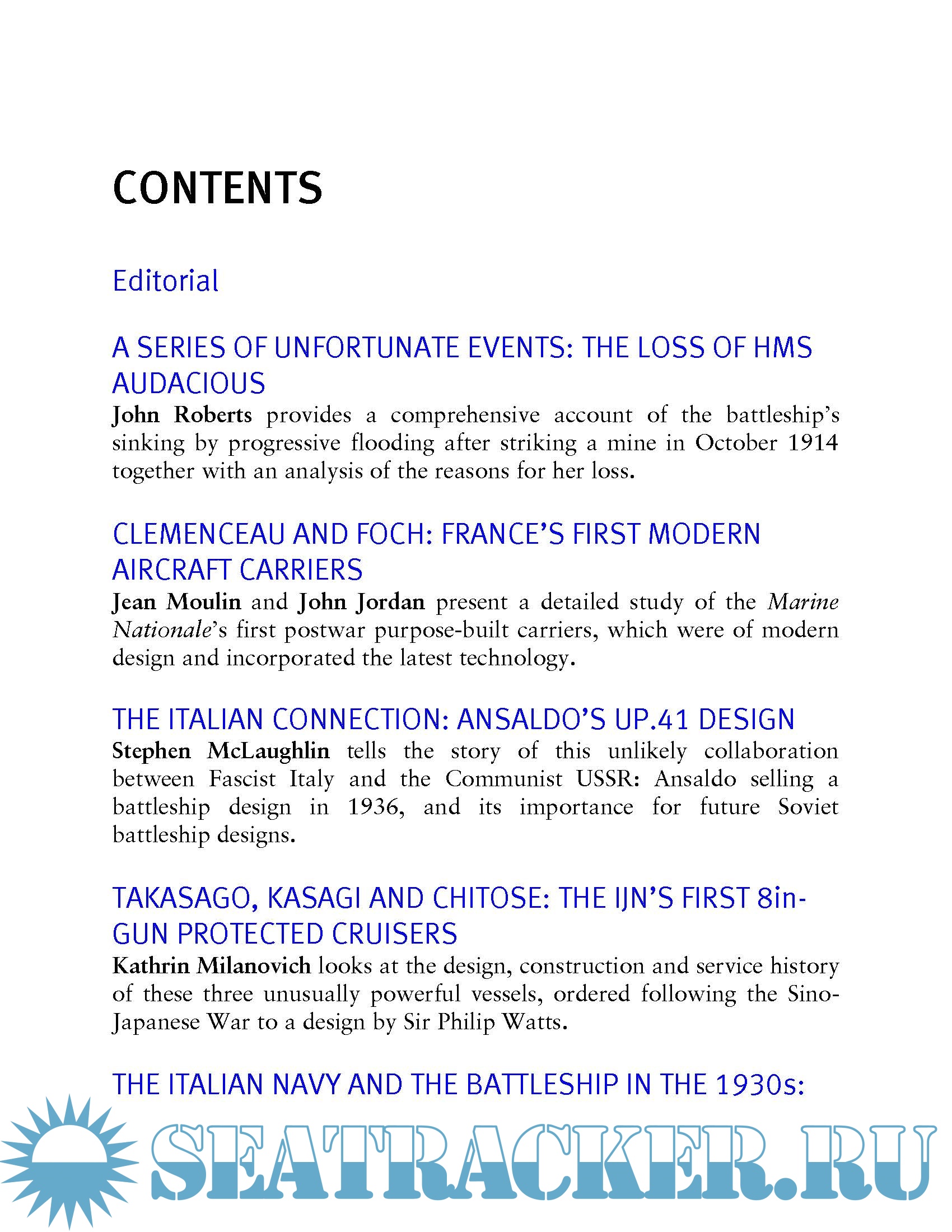 This year's Warship includes features on the secret battleship design that Mussolini's Fascist Italy sold to Stalin's USSR, the little-known German flak ships of World War II, the French aircraft carriers Clemenceau and Foch, and the development of electronic warfare in the Royal Navy.