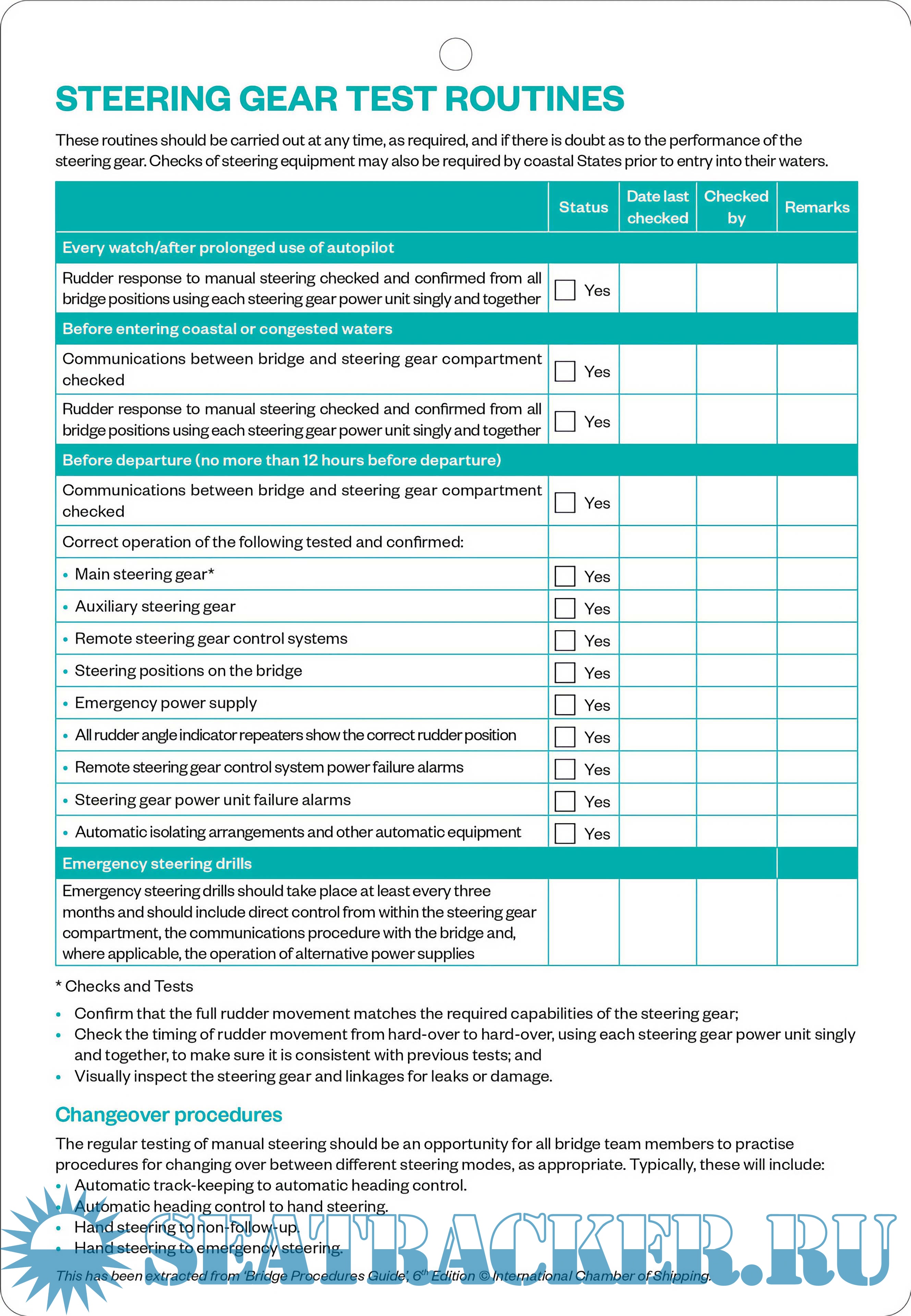 Regular testing of ship’s steering gear is an international requirement and ICS encourages the effective implementation of routine tests. This card prompts the operator on the checks to be conducted so that nothing is overlooked. The card is divided into the following sections: