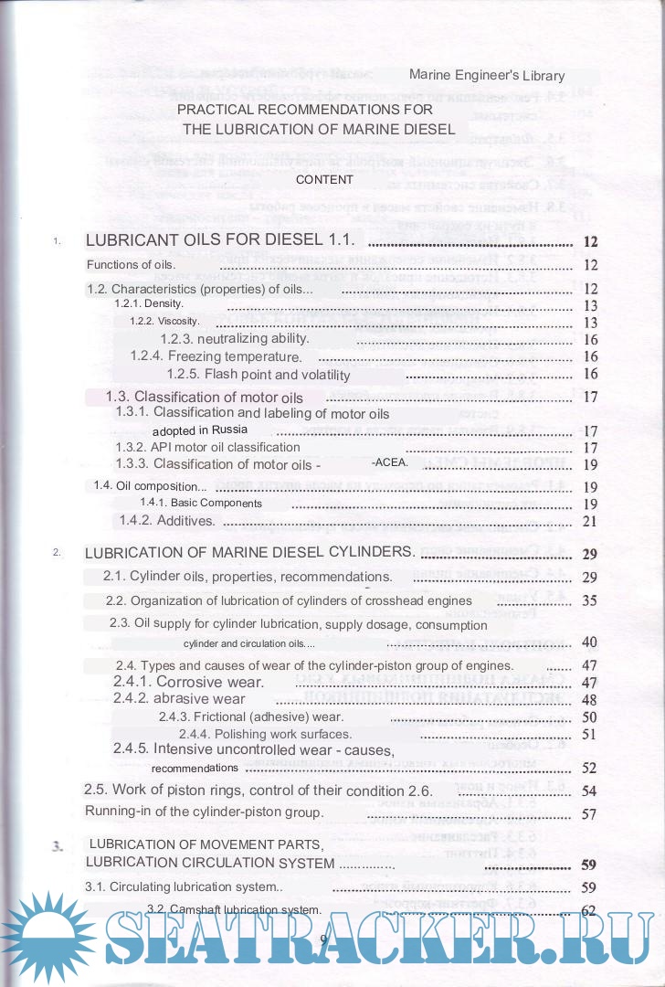 Year: 2007 Language: english Author: I. V. Voznitsky Genre: Technical book Publisher: St. Petersburg Edition: 4th ISBN: 5-94218-010-X Format: PDF Quality: Scanned pages Pages count: 128 Description: This publication is devoted to the problems of lubrication of marine diesel engines and the oils used in them. The role of additives is considered in detail and recommendations are given on the choice of certain types of oils in relation to the level of engine boost, the quality of the fuels used, etc. Considering that oils of foreign companies are mainly used on ships today, along with the classification of oils according to GOST, the classifications adopted in the USA and the European Union are given. Particular attention is paid to the problems of organizing the lubrication of the cylinder-piston group and separately to the lubrication of movement parts. Here, in a systematic way, the reader gets acquainted with the latest recommendations of engine manufacturers and oil manufacturers. Causes of emergency damage and intensive wear and tear, ways to overcome them are shown. Of interest to the reader may be recommendations for changing oils from different manufacturers or mixing them, based on research by British Petroleum, recommendations for the upper limit of alkalinity of circulating oils contaminated with cylinder oil effluents, as well as for limiting values for oil quality indicators in operation. The issues of operation of bearings with thin-walled multilayer shells, the causes of wear and damage and ways to recognize them are considered in detail. Along with information on motor oils, the book provides characteristics of oils for turbine, compressor, hydraulic and heat transfer fluids (thermal fluids). Given that modern oils and fuels are saturated with various chemical compounds that pose a danger to human health, the book includes information about the ways of possible contamination and hygiene measures when working with petroleum products. Additional info: Screenshots translated from russian to english and then compiled into a book for the benefit of english-speaking members of the forum. Apologies for the quality - it's unavoidable in the process of scanning and translating.