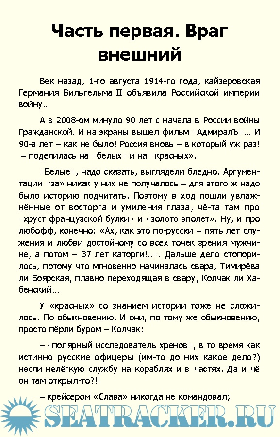 И ведь всё это произошло… за неполные 15 месяцев – с 18 ноября 1918-го, когда вдруг некий адмирал предлагает проект Конституции новой России (странно, правда?) и провозглашается Верховным её правителем (наглость какая!), и по 7 февраля 1920-го, когда этого зверя в облике человеческом, наконец-то, расстреляли. В возрасте 46-ти лет… Но дравшиеся с начала 18-года войска Юга России под командованием Деникина… «с верою присягают» этому выскочке, узнав почти через год войны, что они, оказывается – Белое движение! Убеждённому монархисту присягают, хотя в штабе Деникина служит генерал Алексеев, упорно склонявший императора к отречению!.. Кто он такой, этот Колчак? Откуда взялся и чем известен за ровно 45 лет и два дня своей предыдущей жизни? Да почему авторитет-то у него такой непререкаемый?