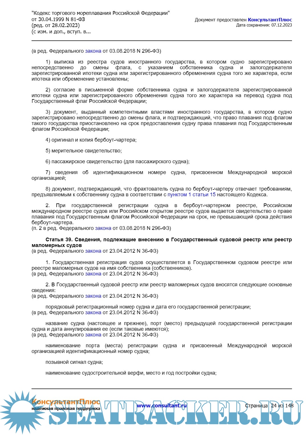 Глава I. Общие положения Статья 1. Отношения, регулируемые Кодексом торгового мореплавания Российской Федерации Статья 2. Понятие торгового мореплавания Статья 3. Сфера применения правил, установленных настоящим Кодексом Статья 4. Использование судов, плавающих под Государственным флагом Российской Федерации, в целях торгового мореплавания Статья 5. Государственное управление в области торгового мореплавания Статья 5.1. Плавание в акватории Северного морского пути Статья 5.2. Правила радиосвязи морской подвижной службы и морской подвижной спутниковой службы Статья 6. Контроль за соблюдением требований настоящего Кодекса Статья 6.1. Расследование аварий или инцидентов на море Статья 7. Судно Статья 8. Судовладелец Статья 9. Морские порты Статья 10. Вместимость судна Статья 11. Расчетная единица Глава II. Судно § 1. Собственность на судно Статья 12. Субъекты права собственности на судно Статья 13. Права собственника судна Статья 14. Передача судна в доверительное управление § 2. Флаг и национальность судна Статья 15. Право плавания под Государственным флагом Российской Федерации Статья 16. Возникновение права плавания под Государственным флагом Российской Федерации Статья 17. Национальность судна Статья 18. Утрата судном права плавания под Государственным флагом Российской Федерации Статья 19. Предоставление судна в пользование и во владение иностранному фрахтователю по бербоут-чартеру, временный перевод судна под флаг иностранного государства § 3. Идентификация судна Статья 20. Название судна Статья 21. Позывной сигнал § 4. Классификация и освидетельствование судов Статья 22. Суда, подлежащие классификации и освидетельствованию. Организации, уполномоченные на классификацию и освидетельствование судов Статья 23. Освидетельствование судов Статья 24. Классификация судов Статья 25. Судовые документы Статья 26. Утратила силу Статья 27. Судовые документы для некоторых категорий судов Статья 28. Утратила силу Статья 29. Выдача судовых документов Статья 30. Признание судовых документов судна, плавающего под флагом иностранного государства Статья 31. Утратила силу Статья 32. Правила ведения судовых документов. Хранение судового журнала Глава III. Регистрация судов, прав на них и сделок с ними Статья 33. Реестры судов Российской Федерации Статья 34. Суда, используемые только для правительственной некоммерческой службы Статья 35. Органы, осуществляющие государственную регистрацию судов Статья 36. Государственная пошлина Статья 37. Условия государственной регистрации судов Статья 38. Государственная регистрация судна, зафрахтованного по договору фрахтования судна без экипажа (бербоут-чартеру) Статья 39. Сведения, подлежащие внесению в Государственный судовой реестр или реестр маломерных судов Статья 40. Сведения, подлежащие внесению в бербоут-чартерный реестр, Российский международный реестр судов и Российский открытый реестр судов Статья 41. Обязанность информировать об изменении сведений, вносимых в реестры судов Статья 42. Первоначальная государственная регистрация судна Статья 43. Изменение порта (места) государственной регистрации судна Статья 44. Повторная государственная регистрация судна Статья 45. Утрата судовых документов, подтверждающих государственную регистрацию судна Статья 46. Отказ в государственной регистрации судна, прав на него и сдел