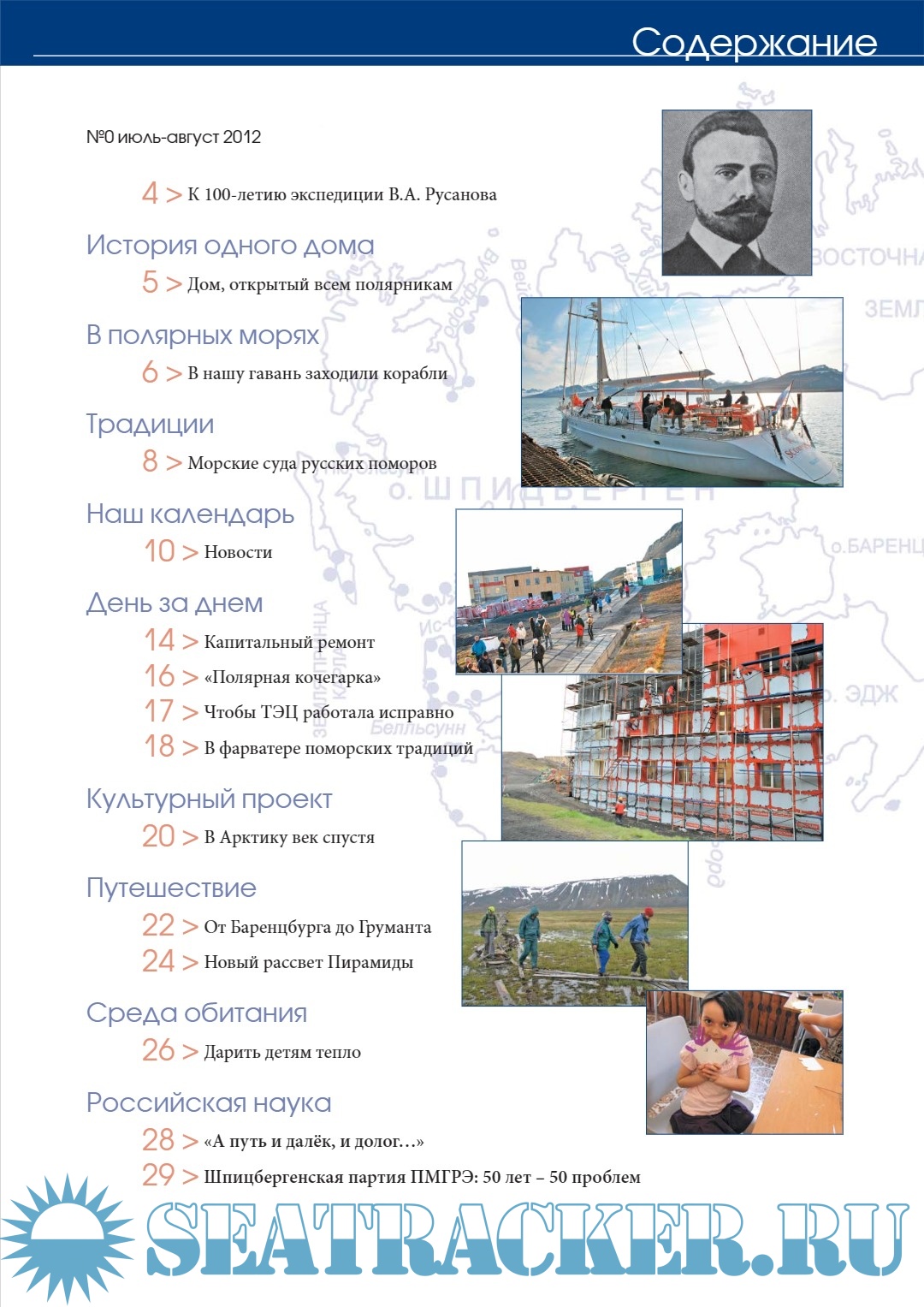 Описание: С этого номера начинает свой отсчет пути журнал «Русский вестник Шпицбергена». Точка этого отсчета – «нулевой километр» всех дорог Арктики, архипелаг Шпицберген. Выход нашего издания совпал с юбилейным годом – 100-летием трех русских арктических экспедиций Г.Брусилова, В.Русанова и Г.Седова. Экспедиции вышли из Архангельска – исторического центра поморской культуры, откуда за много веков до экспедиции В.Баренца отправлялись к берегам Шпицбергена русские поморы. Экспедиции Русанова, с именем которого связано развитие российской угледобычи на архипелаге, и поморским традициям русского судоходства посвящен пилотный номер «Русского вестника Шпицбергена». Русановские места на Шпицбергене в этом году стали центром притяжения не только мореплавателей, прошедших по мемориальному маршруту экспедиции 1912 года, но и путешественников-пешеходов. В эпоху,