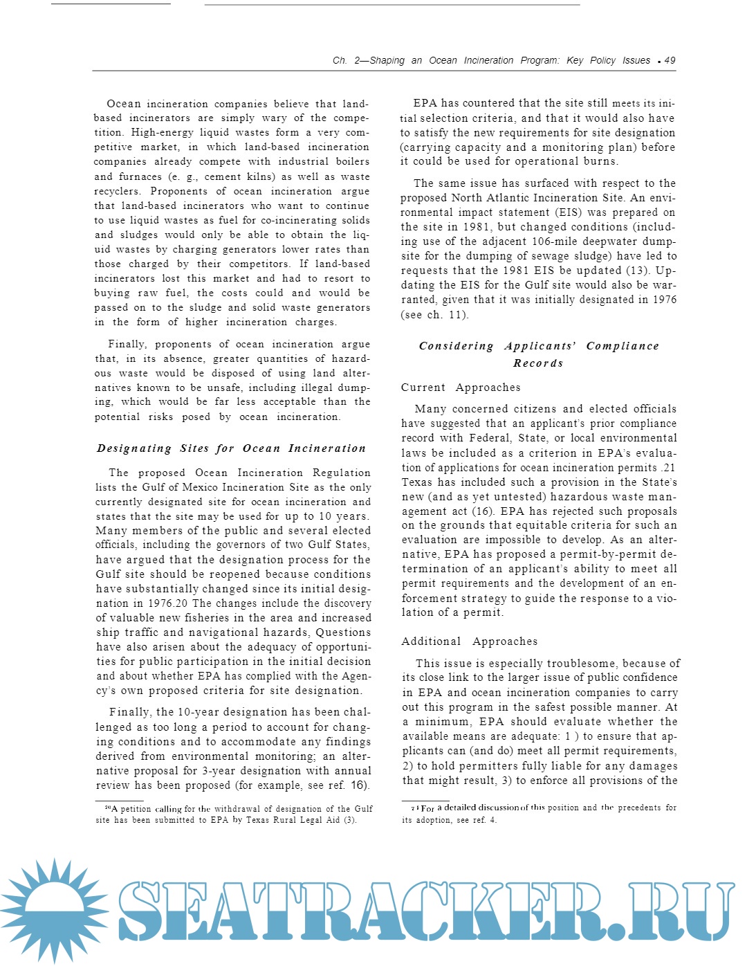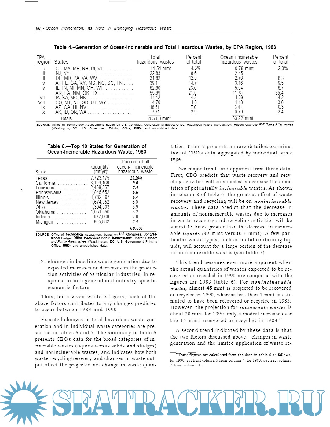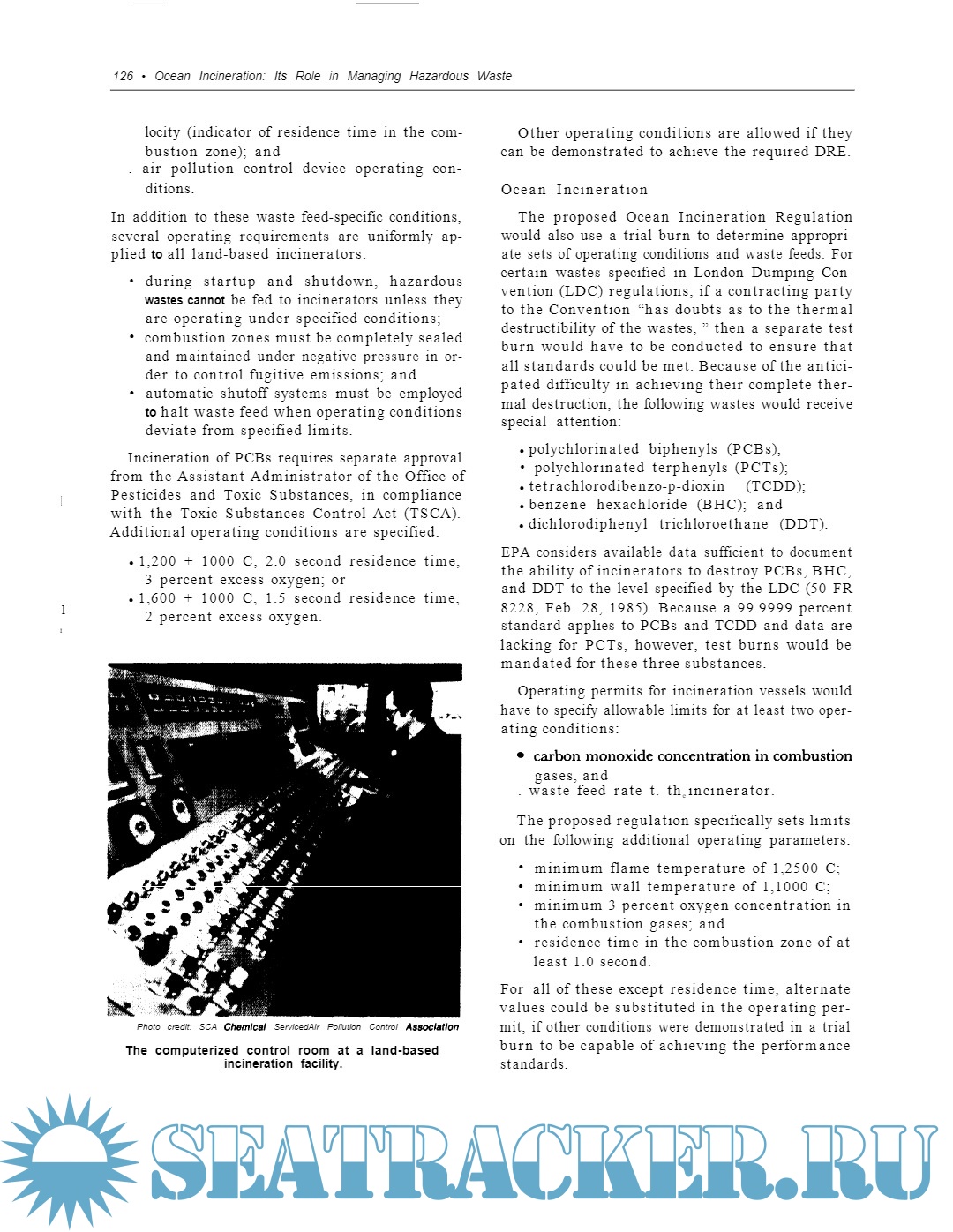 Description: This assessment of ocean incineration includes consideration of the adequacy of regulations; risks to human health and the marine environment relative to the risks of comparable activities; existing and emerging alternatives; the capabilities and limitations of ocean incineration in managing hazardous wastes; and how its use might affect efforts to develop superior waste treatment and reduction practices.