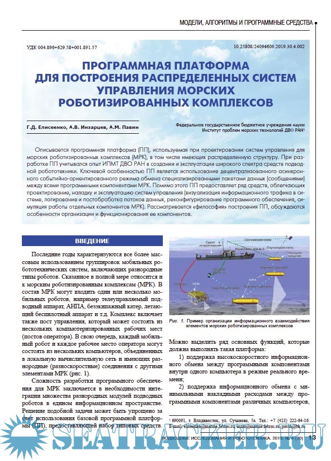 Описание: Научно-технический журнал «Подводные исследования и робототехника» посвящен проблемам исследования и освоения Мирового океана и относится к области знаний, лежащей на стыке наук:- теоретической и прикладной механики, навигации и управления движением, динамики управляемых систем и процессов,- робототехники, мехатроники, автоматизированного конструирования технических устройств, информатики и вычислительной техники,- теоретической и прикладной океанографии, физики океана, гидроакустики, морской геологии, экологии морских акваторий.Цель журнала – систематизировать и объективно отражать все наиболее значимые научно-технические и практические достижения и результаты исследований по освоению подводного пространства и морского дна, способствовать развитию новых идей, средств и методов подводных исследований и робототехники, консолидировать усилия научных и деловых кругов, потенциальных потребителей новейших достижений в сфере подводных технологий.Журнал «Подводные исследования и робототехника» публикует научно-технические статьи, проблемные, обзорные, дискуссионные материалы по всем направлениям, относящимся к методам и техническим средствам исследования и освоения океана, включая подводные аппараты и роботы, акустические, гидрологические, геофизические средства и методы исследования физических полей океана.Авторами публикаций журнала являются авторитетные ученые, ведущие специалисты и молодые исследователи из научных организаций и вузов Москвы и Подмосковья, Санкт-Петербурга, Зарубежья, Дальнего Востока, Урала, Сибири, и других регионов России. Для научного рецензирования и редактирования публикуемых статей привлекаются авторитетные специалисты в соответствующих областях знаний.Читательская аудитория - широкий круг ученых и специалистов, работающих в области исследования морских глубин, деловые круги и потенциальные потребители научно-технических разработок и инновационных проектов, молодые ученые, аспиранты и студенты, специализирующаяся в указанной области.