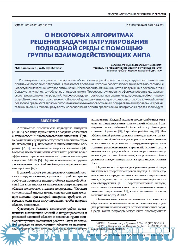 СОДЕРЖАНИЕ СИСТЕМЫ, ТЕХНОЛОГИИ И ЭКСПЕРИМЕНТЫ 4 Коноплин А.Ю., Денисов В.А., Даутова Т.Н., Кузнецов А.Л., Московцева А.В. Технология использования ТНПА для комплексного исследования глубоководных экосистем МОДЕЛИ, АЛГОРИТМЫ И ПРОГРАММНЫЕ СРЕДСТВА 13 Елисеенко Г.Д., Инзарцев А.В., Павин А.М. Программная платформа для построения распределенных систем управления морских роботизированных комплексов 21 Спорышев М.С., Щербатюк А.Ф. О некоторых алгоритмах решения задачи патрулирования подводной среды с помощью группы взаимодействующих АНПА 27 Ваулин Ю.В., Дубровин Ф.С., Щербатюк Д.А., Щербатюк А.Ф. О методах обеспечения навигации групп АНПА: краткий обзор СРЕДСТВА И МЕТОДЫ ПОДВОДНЫХ ИССЛЕДОВАНИЙ 37 Касаткин Б.А., Злобина Н.В., Касаткин С.Б. Пограничные волны в проблеме обнаружения подводных источников шума 49 Кузькин В.М., Матвиенко Ю.В., Переселков С.А. Применение интерферометрической обработки для локализации малошумных источников звука 58 Хворостов Ю.А., Матвиенко Ю.В. Характеристики собственного шумоизлучения малогабаритного АНПА 64 Захаров А.Н., Белобловский В.Н., Полищук С.В. Определение спектрального состава подводного шума движителя необитаемого подводного аппарата 71 Рефераты
