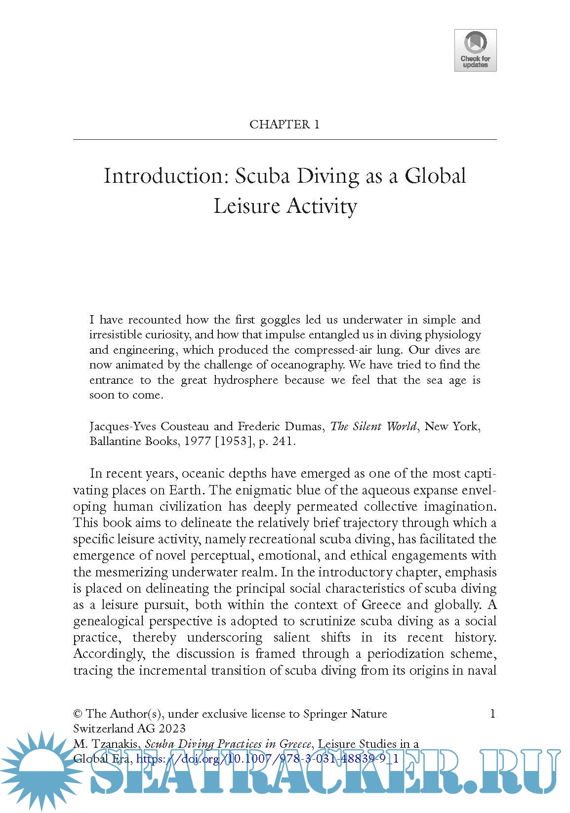 Year: 2024 Language: English Author: Manolis Tzanakis Genre: Research papers Publisher: Palgrave MacMillan Edition: 1st (January, 2024) ISBN: 9783031488399 Format: PDF Quality: eBook Pages count: 320 Description: This book provides a historical-sociological analysis of recreational scuba diving practices. Starting from a national case study, Greece, the book analyzes the gradually evolving global institutional arrangements of this version of underwater recreational activities. Based on the author’s experience as a former diving instructor and on an historical and sociological research of scuba diving in Greece, the book examines the stages of institutionalization of scuba diving as a leisure practice on a global scale, from 1945 to the present day. It combines two traditions: the phenomenological approach of underwater multisensory embodied experience and tourism studies. The two main research questions that the project answers are (a) how scuba diving has historically been shaped as a leisure activity, (b) how has underwater experience been conceptually shaped as a leisure activity. This case is an excellent example for exploring the relationship between society, technology, body and modern practices of self in the late modernity world, under a phenomenological and historical perspective.