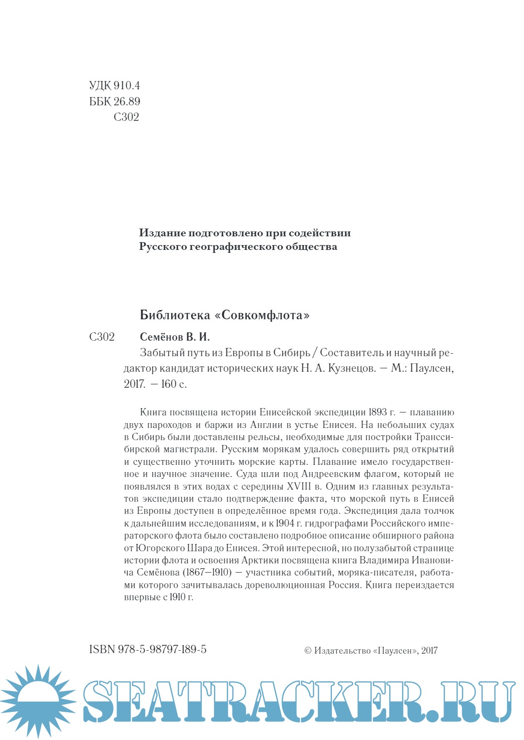 Год выпуска: 2017 Язык: русский Автор: Семёнов В.И. Формат: PDF Качество: Изначально компьютерное (eBook) Количество страниц: 160 Описание: Книга посвящена истории Енисейской экспедиции 1893 г. – плаванию двух пароходов и баржи из Англии в устье Енисея. На небольших судах в Сибирь были доставлены рельсы, необходимые для постройки Транссибирской магистрали. Русским морякам удалось совершить ряд открытий и существенно уточнить морские карты. Плавание имело государственное и научное значение. Суда шли под Андреевским флагом, который не появлялся в этих водах с середины XVIII в. Одним из главных результатов экспедиции стало подтверждение факта, что морской путь в Енисей из Европы доступен в определённое время года. Экспедиция дала толчок к дальнейшим исследованиям, и к 1904 г. гидрографами Российского императорского флота было составлено подробное описание обширного района от Югорского Шара до Енисея. Этой интересной, но полузабытой странице истории флота и освоения Арктики посвящена книга Владимира Ивановича Семёнова (1867–1910) – участника событий, моряка-писателя, работами которого зачитывалась дореволюционная Россия. Книга переиздается впервые с 1910 г.