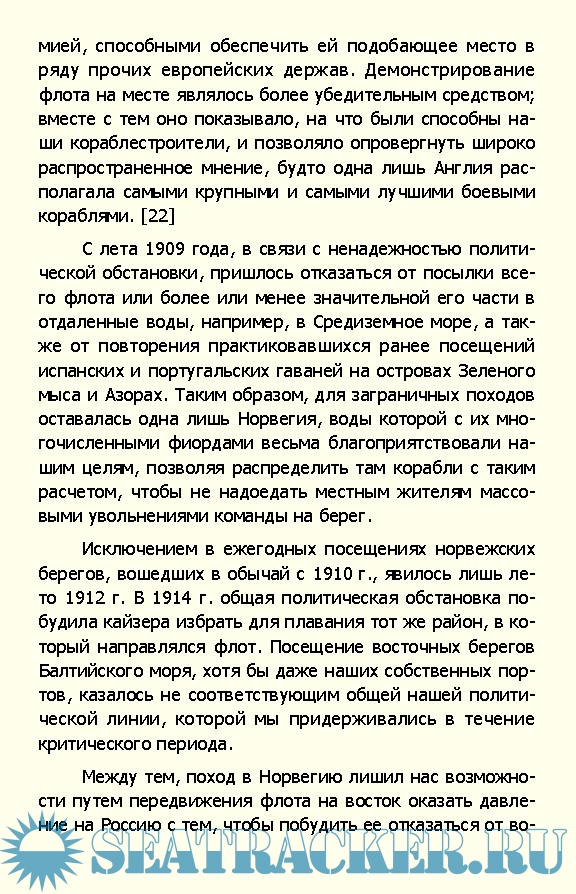 Содержание Предисловие Введение Часть первая. Первые два года войны до Ютландского боя Глава I. Начало войны Глава II. Соотношение сил и стратегическое положение Глава III. В ожидании неприятельского нападения Глава IV. Вторжение англичан в Германскую бухту Глава V. Осенние и зимние месяцы первого года войны Глава VI. Обстрел Скарборо и Хартлпула и бой крейсеров у Доггер-банки Глава VII. Ход войны в 1915 году Глава VIII. Подготовка к усилению деятельности флота Глава IX. Операции в Хуфдене. Обстрел Ярмута и Лоустофта Часть вторая. От Ютландского боя до начала неограниченной подводной войны Глава X. Ютландский бой Глава XI. После боя Глава XII. Налеты воздушных кораблей Часть третья. Подводная война Глава XIII. Военно-политическое значение подводной войны Глава XIV. Наши подводные лодки и их тактика Глава XV. Деятельность флота под знаком подводной войны Глава XVI. Захват балтийских островов и занятие Гельсингфорса Глава XVII. Бои наших легких морских сил и операции флота у норвежских берегов Глава XVIII. Военно-морское командование Заключение Лорд Фишер и британский план войны на море (Вместо послесловия) Примечания Список иллюстраций