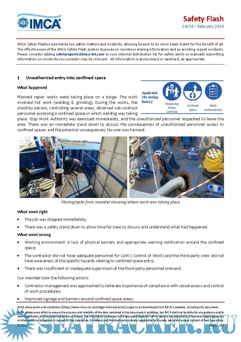 Description: The International Marine Contractors Association ( IMCA ) Safety Flashes disseminate important information on incidents and potential hazards and the lessons learnt from them that can help prevent incidents occurring elsewhere in the industry.