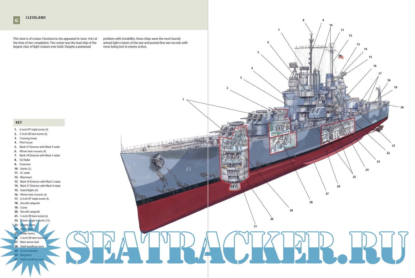 Description: During World War II, the United States built 72 light cruisers of various classes. In response to the severe air threat that surface ships faced, new cruisers were designed with increasingly heavy antiaircraft weaponry as well as the traditional six-inch guns. With the speed and range to keep up with aircraft carriers, and their considerable antiaircraft capability, they were a mainstay of the carrier escorts.