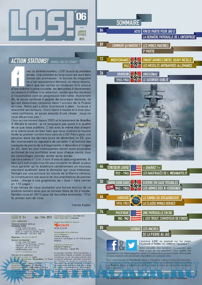Year: 2013 Language: French Author: Collective Edition: 2013 01-02 Format: PDF Quality: eBook Pages count: 84 Description: LES ÉDITIONS CARAKTÈRE PRENNENT LE LARGE EN LANÇANT UN NOUVEAU MAGAZINE CONSACRÉ À LA GUERRE NAVALE !Les sujets passionnants ne manquent pas et LOS ! met un point d’honneur à les présenter au lecteur comme cela n’a jamais été fait dans la presse française jusqu’à présent. Un seul mot d’ordre pour l’équipe rédactionnelle : rigueur scientifique et présentation ludique !S’appuyant sur un fond photographique d’exception, sur des plans de bateaux et d’avions, les éditions Caraktère innovent une fois de plus en vous proposant aussi des vues 3D détaillées, le tout au service de textes soigneusement rédigés par des auteurs spécialisés. Vous comprendrez ainsi comment fonctionne un submersible, comment se déroule un combat naval, comment est conçu un cuirassé ou comment attaquent les avions-torpilleurs !Revivez au fil des pages l’aventure humaine exceptionnelle des matelots de la marine marchande affrontant les U-Boote en Arctique, ou celle des pilotes embarqués sur les porte-avions américains et japonais. Lisez les exploits des hommes-grenouilles italiens en Méditerranée, des équipages des vedettes lance-torpilles dans la Manche, des sous-marins soviétiques de la guerre froide ou des grands cuirassés de 1914-18