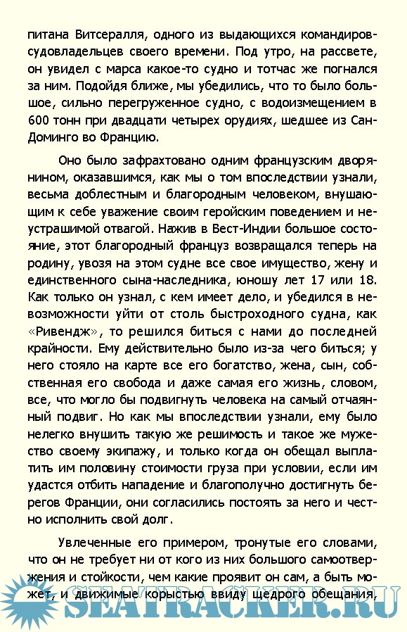Год выпуска: 2008 Язык: Русский Автор: Фредерик Марриет Издательство: Вече Издание: Морской авантюрный роман Формат: FB2 Качество: Изначально компьютерное (eBook) Количество страниц: 423 Описание: Молодой человек по имени Александр Месгрев, изгнанный в 17 лет из родительского дома, поступает служить на Приватир - судно, которому в военное время разрешалось нападать на торговые суда противника. Юному Александру предстоит полная необыкновенных приключений жизнь: он участвует в захвате неприятельских кораблей, сам попадает в руки пиратов, оказывается пленником дикарей в Африке и чудом спасается.
