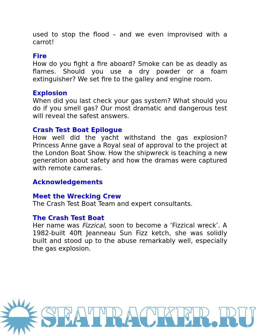Description: From the people behind the UK's leading sailing magazine for cruisers comes Crash Test Boat, a dramatic documentation of controlled sailing disasters which has the potential to save the lives of each and every seaman who buys it.Crash Test Boat is unique in its field, with no other title on the market aimed at explicitly revealing at first hand what happens when a boat encounters a major disaster. On the spot reporting with action photographs show what happens when typical family boats fall victim to eight different types of sailing disaster. How quickly does a cabin fill with water when the hull is holed? How do you control a gas leak or explosion? What should you do first when dealing with a dismasting?By providing cruising and racing yachtsmen with vivid accounts of such extreme events, Crash Test Boat equips the reader with vital knowledge on what to do if disaster strikes and, ultimately, gives everyone on board a greater chance of survival if the boat is overcome.