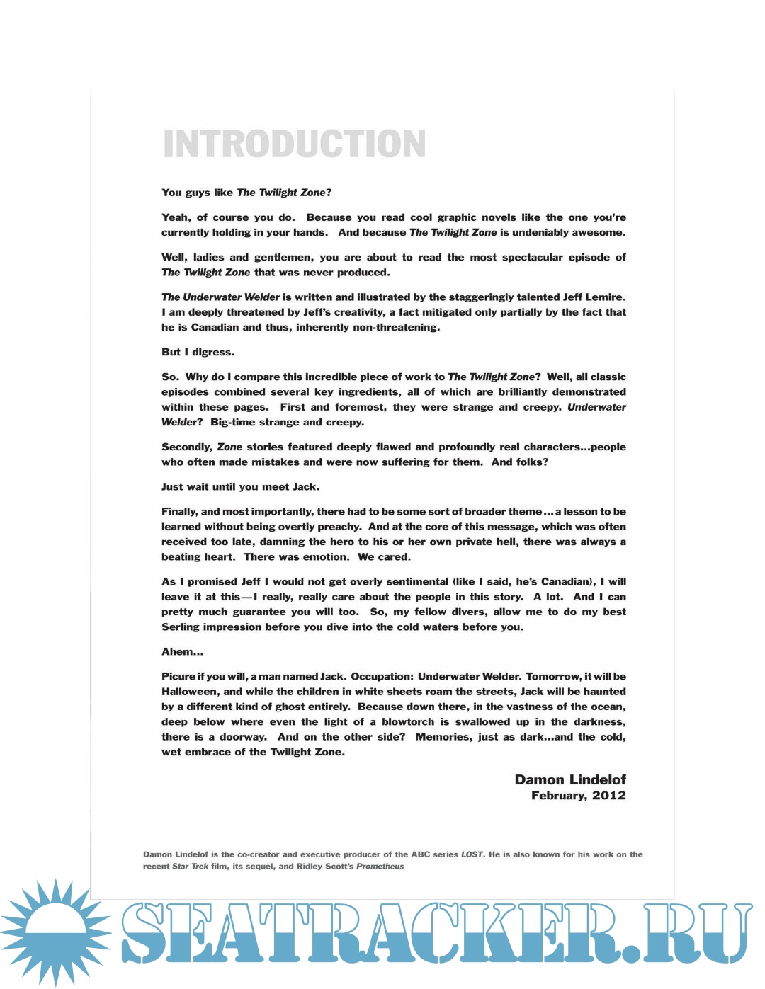 Description: Pressure. As an underwater welder on an oilrig off the coast of Nova Scotia, Jack Joseph is used to the immense pressures of deep-sea work. Nothing, however, could prepare him for the pressures of impending fatherhood. As Jack dives deeper and deeper, he seems to pull further and further away from his young wife, and their unborn son. But then, something happens deep on the ocean floor. Jack has a strange and mind-bending encounter that will change the course of his life forever. ... Equal parts blue-collar character study and mind-bending science fiction epic, The Underwater Welder is a 250-page graphic novel that explores fathers and sons, birth and death, memory and truth, and treasures we all bury deep down inside.