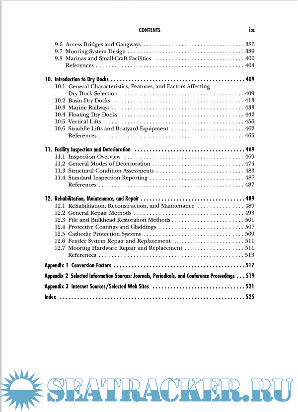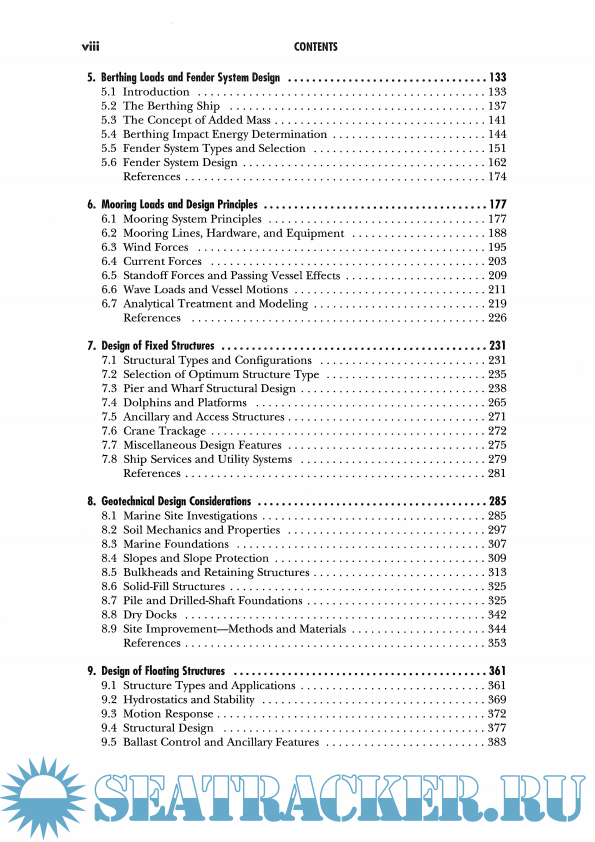 Year: 2004 Language: English Author: John W. Goythwoite Genre: Technical book Publisher: American Society of Civil Engineers Edition: 2nd ISBN: 0-7844-0726-6 Format: PDF Quality: Scanned pages Pages count: 561 Description: This valuable handbook for practicing engineers covers the design of marine structures for the berthing, mooring, and repair of vessels, such structures as piers, wharves, bulkheads, quay walls, dolphins, dry docks, floating docks, and various ancillary structures. Descriptions of vessel characteristics, dry dock types, and inspection, as well as assessment of existing facilities are all incorporated in this comprehensive marine facilities reference. At the end of each chapter, in-depth references are provided so that a given subject can be readily explored. Important design standards, 197 line drawings, and 53 photos, as well as numerous graphs and tables for quick reference, are incorporated in the book.