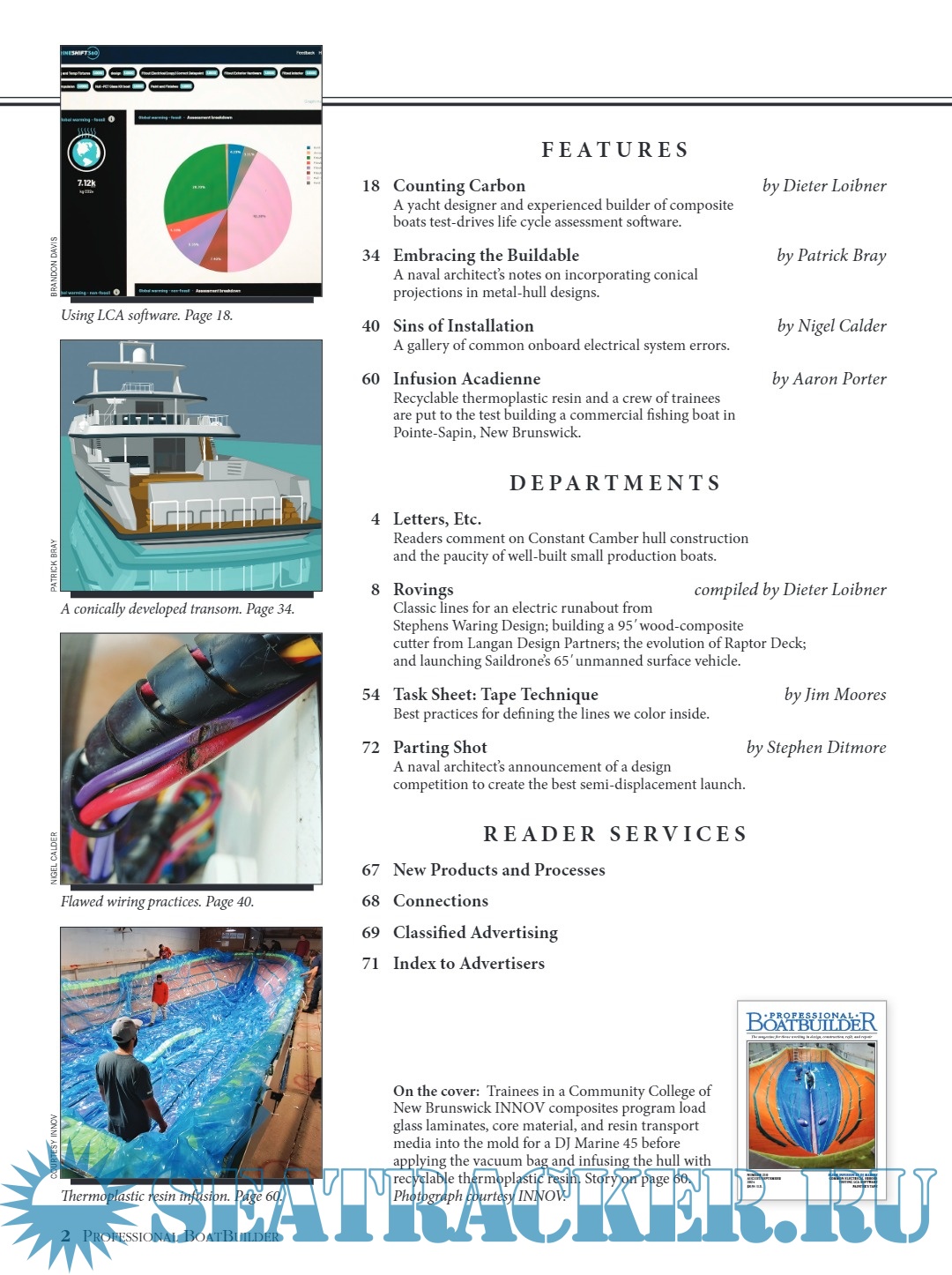 Description: Professional BoatBuilder magazine is written and edited for boatbuilders, repairers, designers, and surveyors.Published six times a year, by WoodenBoat Publications, Inc., it focuses on materials, design, and construction techniques and repair solutions chosen by marine professionals.Regular technical articles provide detailed, real-world examples to improve the efficiency and quality of their work. Professional BoatBuilder has an audited circulation of 24,000 readers, worldwide.