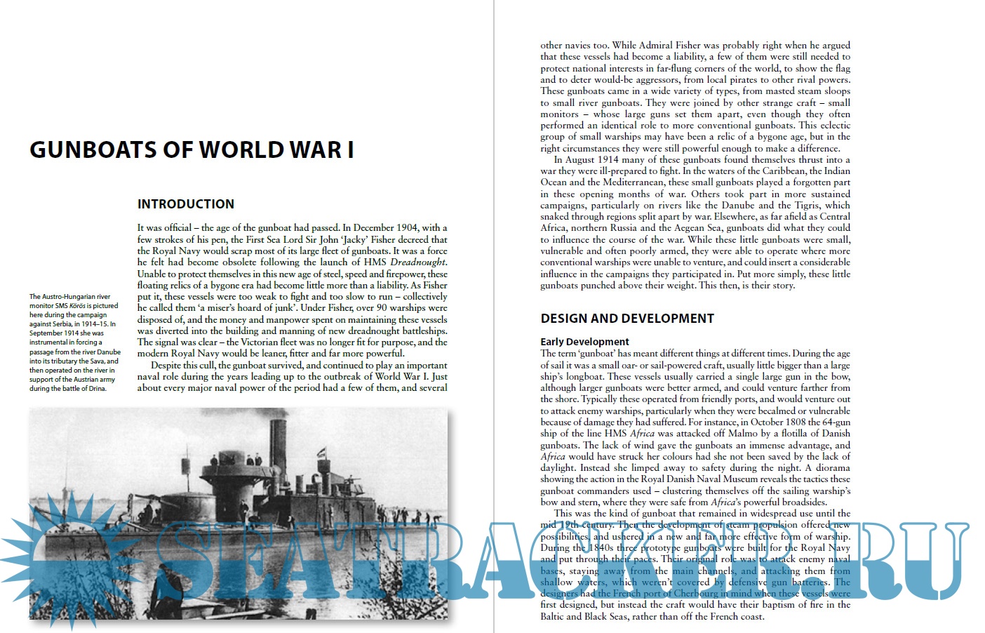 Year: 2015 Language: English Author: Angus Konstam Genre: History Publisher: Osprey Publishing Edition: (New Vanguard 221 Format: PDF Quality: eBook Pages count: 40 Description: From the Mediterranean to the Black Sea, from the Balkans to Mesopotamia, gunboats played an influential part in the story of World War I. This detailed technical guide to the gunboats of all the major navies of the war means that, for the first time, the story can be told. Naval action in World War I conjures up images of enormous dreadnoughts slugging it out in vast oceans. Yet the truth is that more sailors were killed serving on gunboats and monitors operating far from the naval epicentre of the war than were ever killed at Jutland. Gunboat engagements during this war were bloody and hard fought, if small in scale. Austrian gunboats on the Danube fired the first shots of the war, whilst German, British and Belgian gunboats fought one of the strangest, most intriguing naval campaigns in history in far-flung Lake Tanganyika.