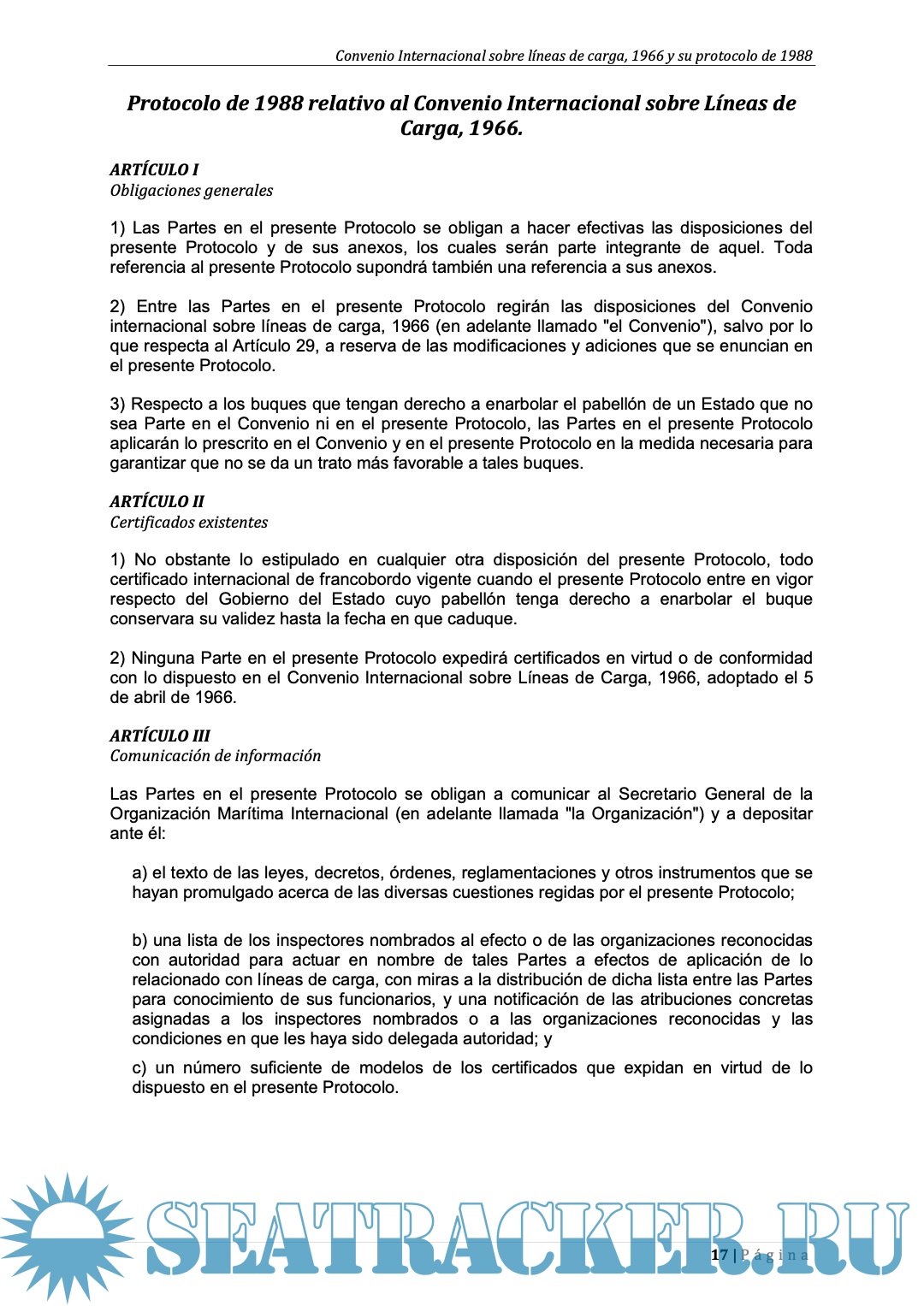 Description: Texto consolidado del Convenio Internacional sobre las Líneas de Carga, 1966, y su protocolo de 1988: Artículos y Anexos.