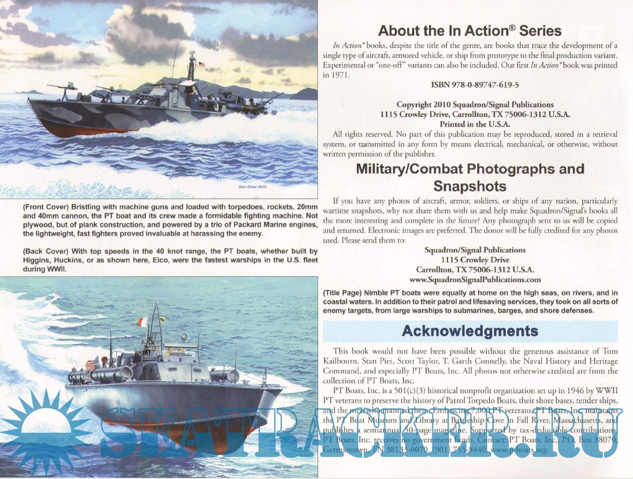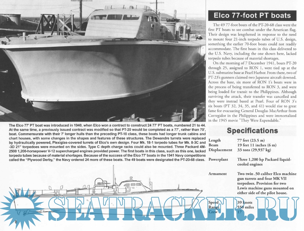 Year: 2010 Language: English Author: David Doyle Genre: History Publisher: Squadron/Signal Publications Edition: Warships No. 34 Format: PDF Quality: eBook Pages count: 66 Description: American Patrol Torpedo - or PT - boat crews served valiantly in every theater during WWII. From the Aleutians to the Mediterranean, these men harassed enemy shipping, launched attacks against much more formidable warships, rescued downed air crews, and spirited General Douglas MacArthur to safety from Corregidor Island in March of 1942. PT boats also laid mines and smokescreens, coordinated air-sea rescue actions, and conducted intelligence and raiding operations. This volume chronicles the evaluation, use, and eventual destruction of the US PT boat fleet through 180 photographs, many of them color. Coverage includes ELCO, Higgins, and Huckins boats; 64 pages.